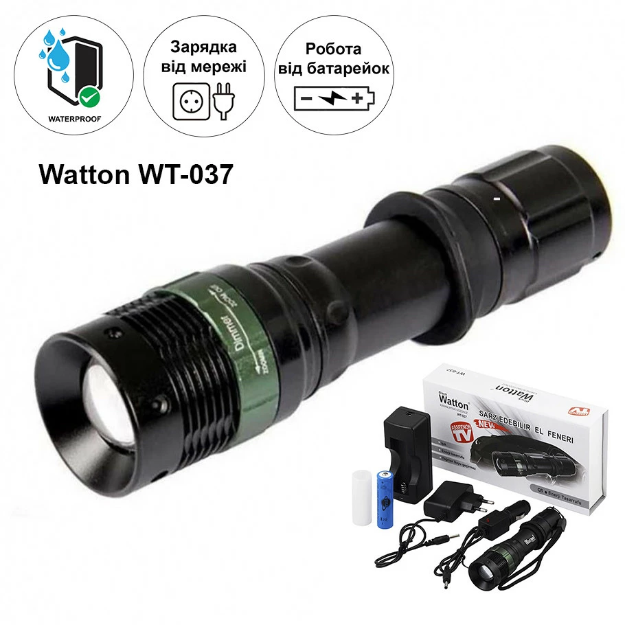 Акумуляторний металевий тактичний світлодіодний ліхтар Watton WT-037 ліхтарик ударостійкий