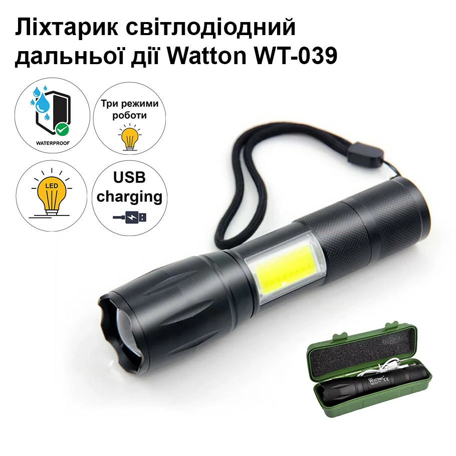Акумуляторний світлодіодний ліхтарик Watton WT-039 1000 Лм удароміцний алюмінієвий ручний ліхтар
