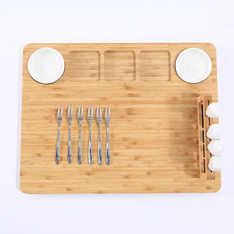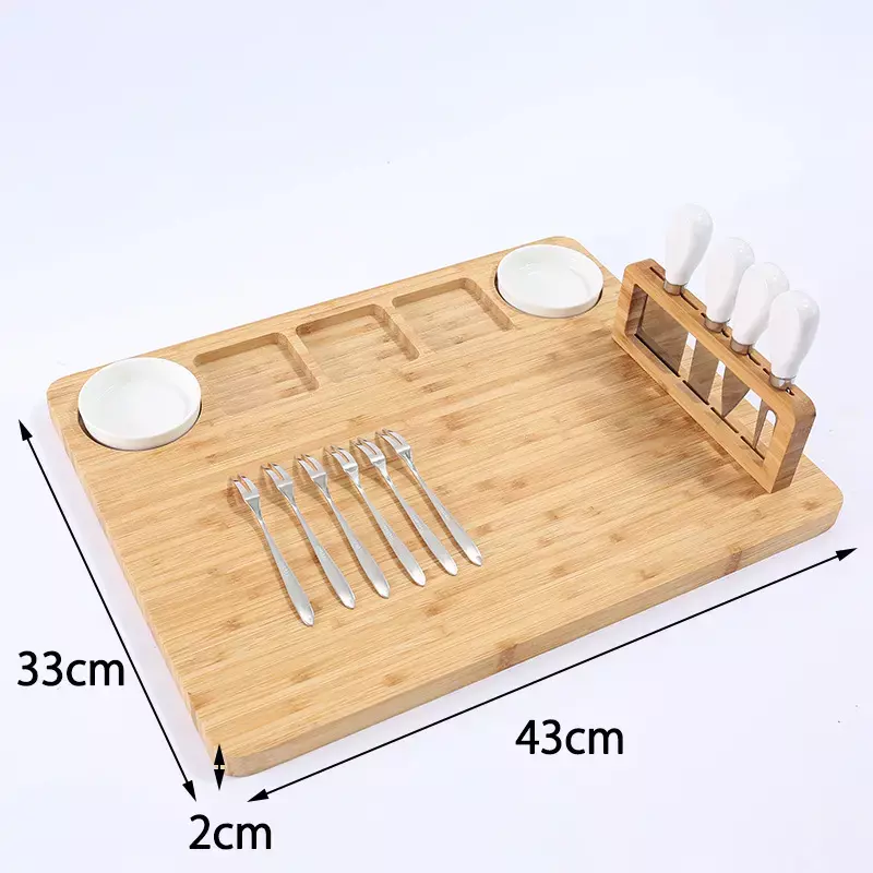 Дошка оснащена окремими відсіками для зручного розміщення продуктів і двома керамічними мисками для соусів. До комплекту входять 4 ножі для сиру зі зручними ручками та 6 мініатюрних виделок, які роблять процес подачі ще більш вишуканим. Усі інструменти легко зберігаються в спеціально передбачених відділеннях, що спрощує організацію.