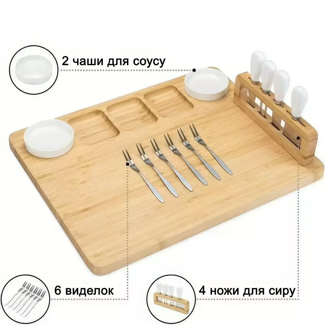 Комплектація: дошка, 4 ножі для сиру, 6 виделок, 2 керамічні миски