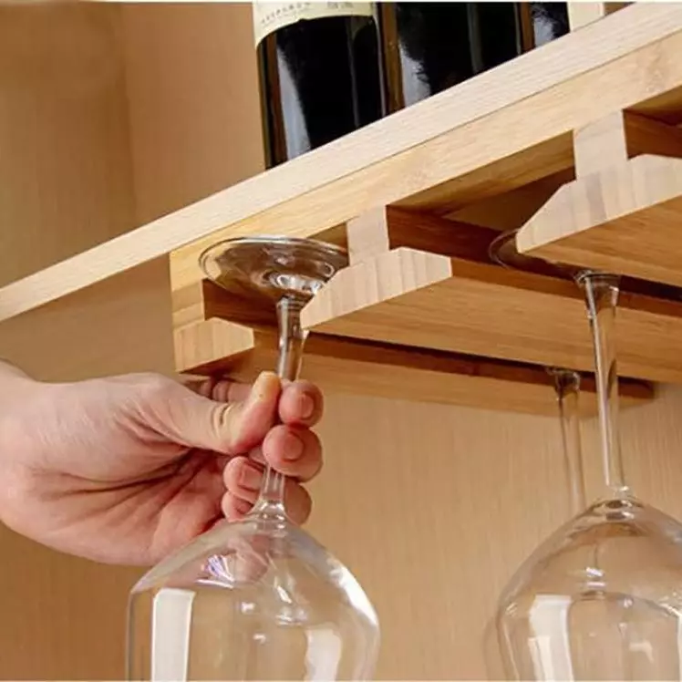 Бамбукова полиця легко кріпиться під полицями або шафами, забезпечуючи надійне зберігання келихів у три ряди. Натуральний матеріал надає виробу екологічного та сучасного вигляду, а міцність гарантує довговічність використання.