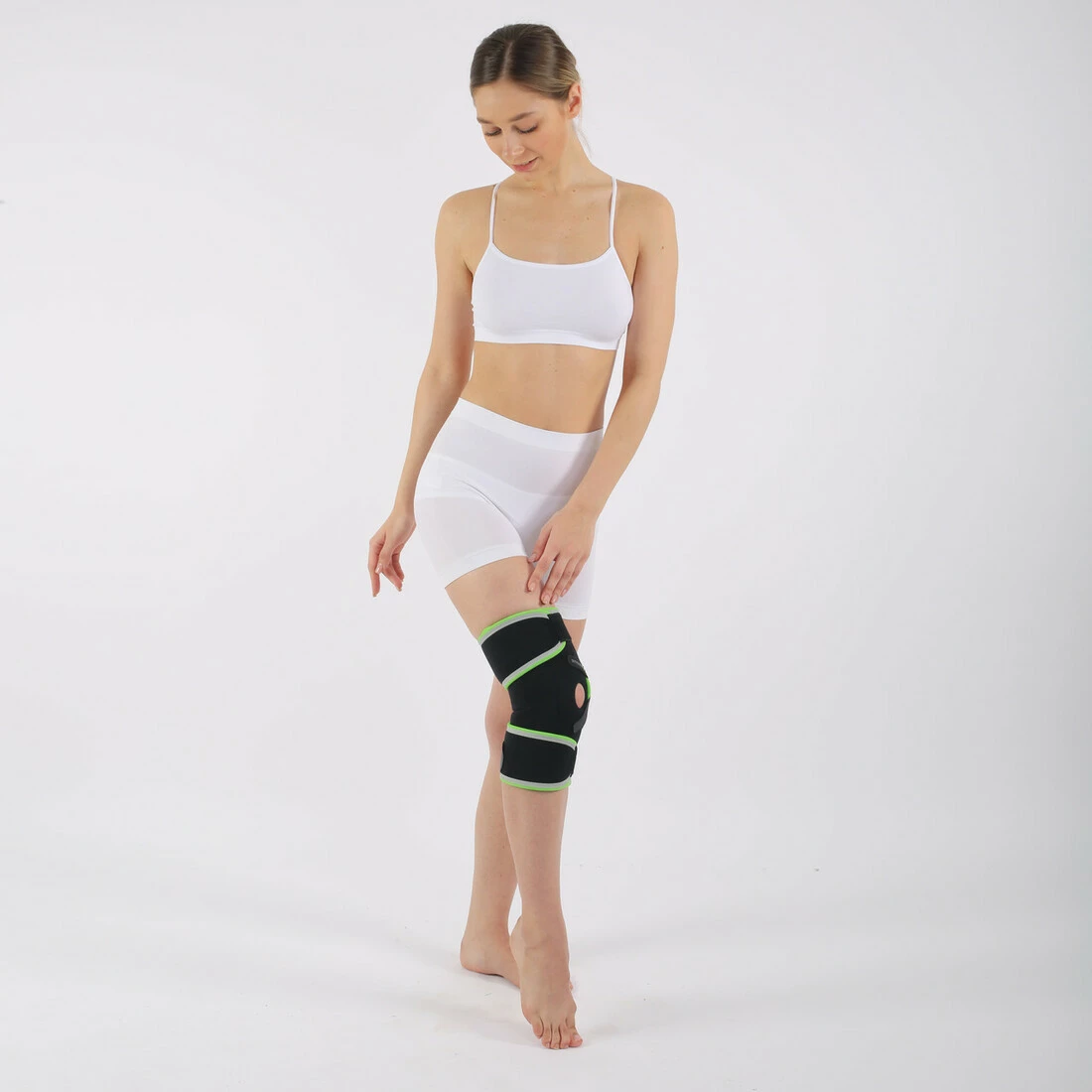 Анатомічний дизайн з повністю відкритою передньою частиною з м'якою окантовкою для комфорту, підходить як для лівого, так і для правого коліна та зручний у носінні. Зменшує біль, знімаючи навантаження на суглоб. Показання: артрит, остеоартрит, тендиніт та нестабільність зв'язок, розтягування колінного суглоба та 1-е та 2-ге розтягування, біль у колінній чашці та спортивні травми, післяопераційний період або травма з метою захисту та реабілітації, ураження меніска.