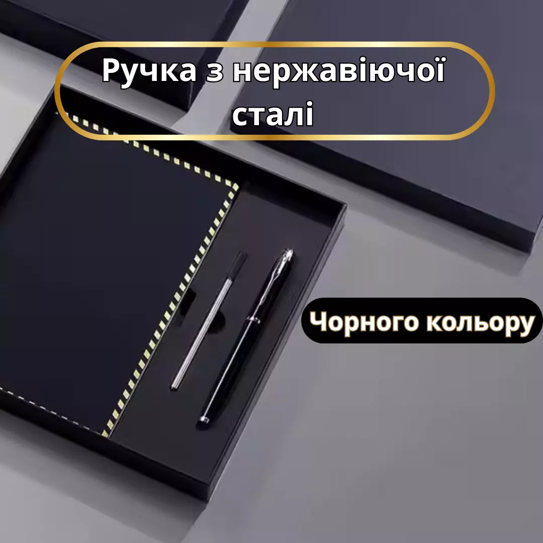 Цей вишуканий набір ідеально поєднує стиль, практичність і якість. Блокнот у чорній обкладинці з еко-шкіри виглядає елегантно та підходить як для ділових зустрічей, так і для особистих записів. Металева ручка з чорним стрижнем забезпечує плавне письмо, а запасний картридж продовжить термін її служби. Вишукана подарункова упаковка додає набору статусності, роблячи його чудовим варіантом для подарунка.