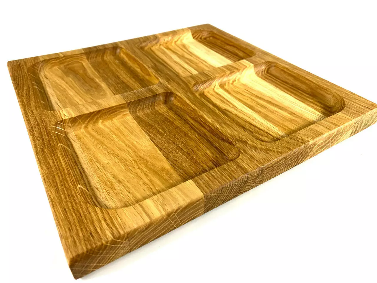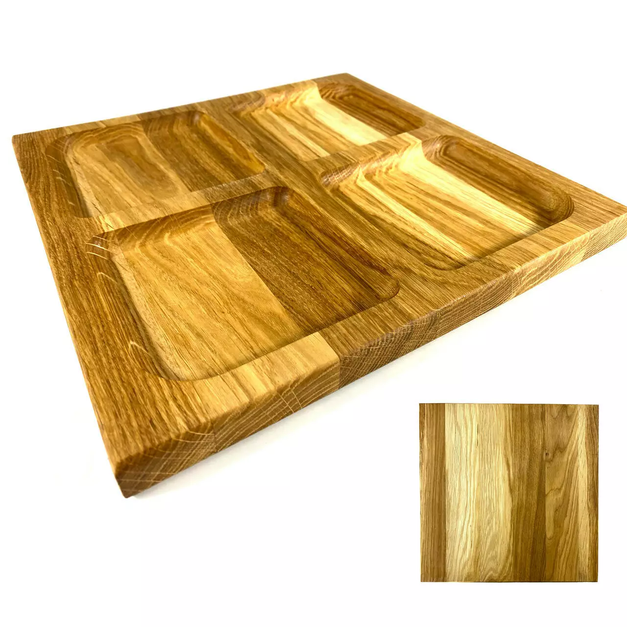 Кожна тарілка виготовлена з цільного дерева товщиною 2 см та вирізана з різноманітними ємностями, ідеальними для подачі різноманітних закусок. Від смачних фруктів до апетитних горішків, вони будуть виглядати дуже привабливо на наших тарілках.
