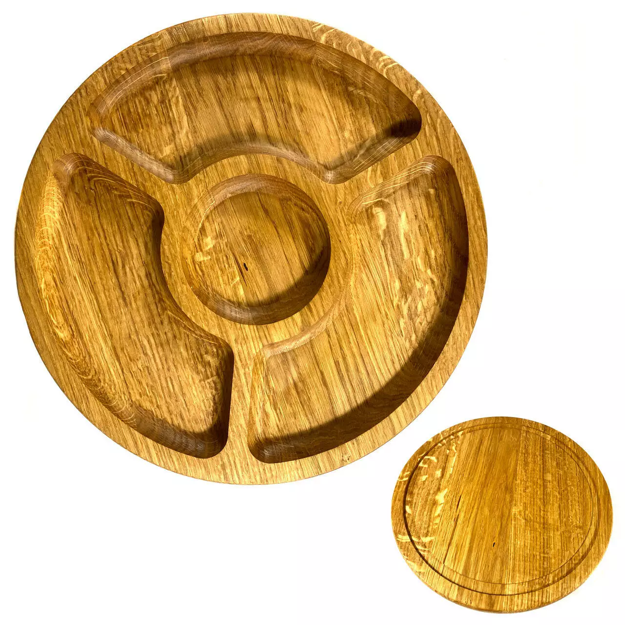Кожна тарілка виготовлена з цільного дерева товщиною 2 см та вирізана з різноманітними ємностями, ідеальними для подачі різноманітних закусок. Від смачних фруктів до апетитних горішків, вони будуть виглядати дуже привабливо на наших тарілках.