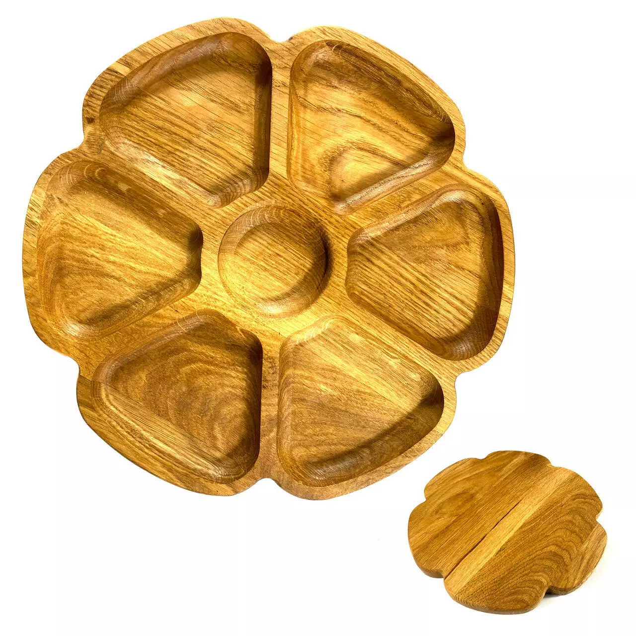 Кожна тарілка виготовлена з цільного дерева товщиною 2 см та вирізана з різноманітними ємностями, ідеальними для подачі різноманітних закусок. Від смачних фруктів до апетитних горішків, вони будуть виглядати дуже привабливо на наших тарілках.