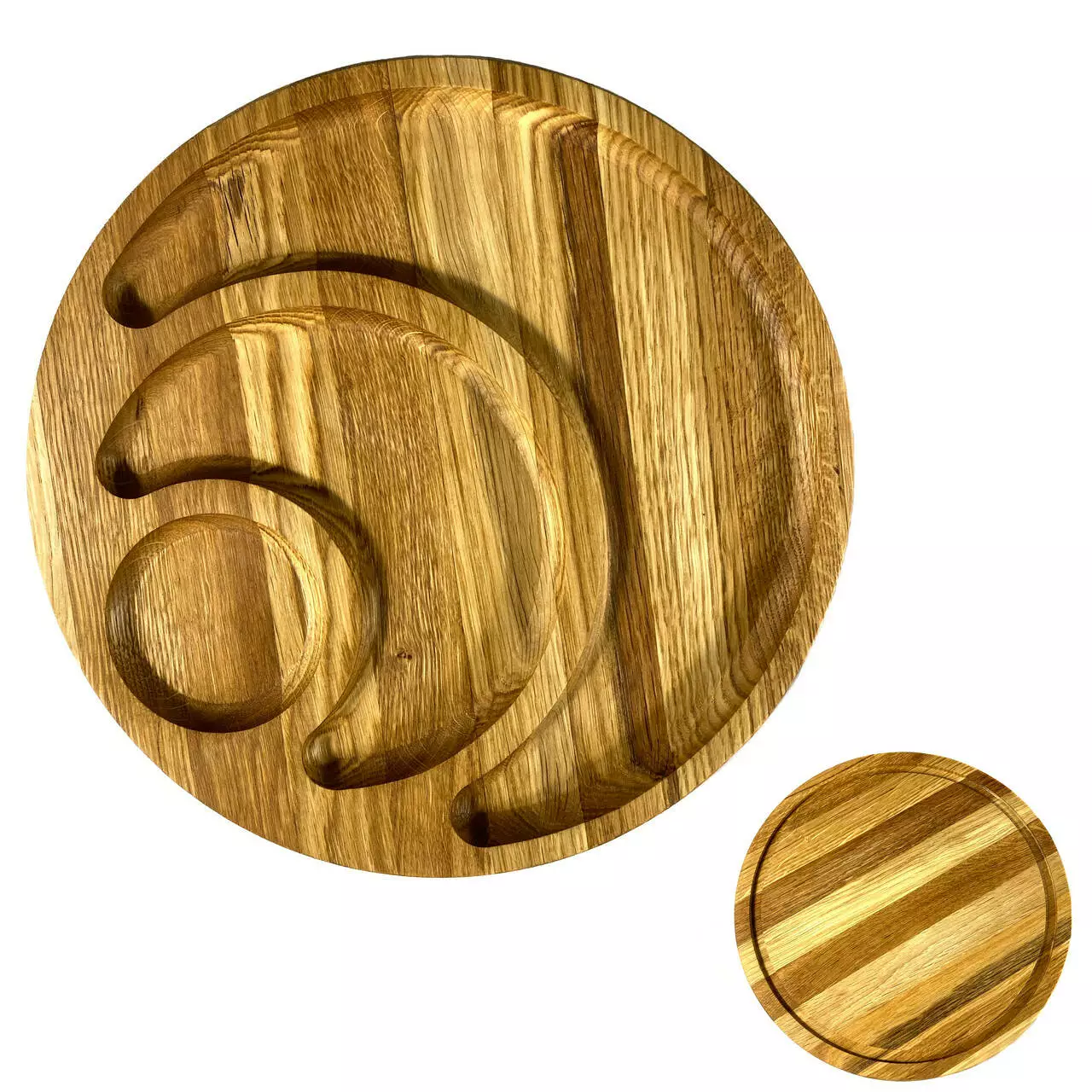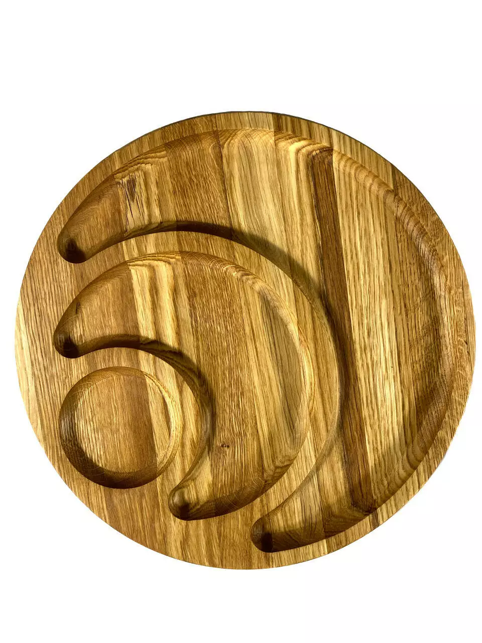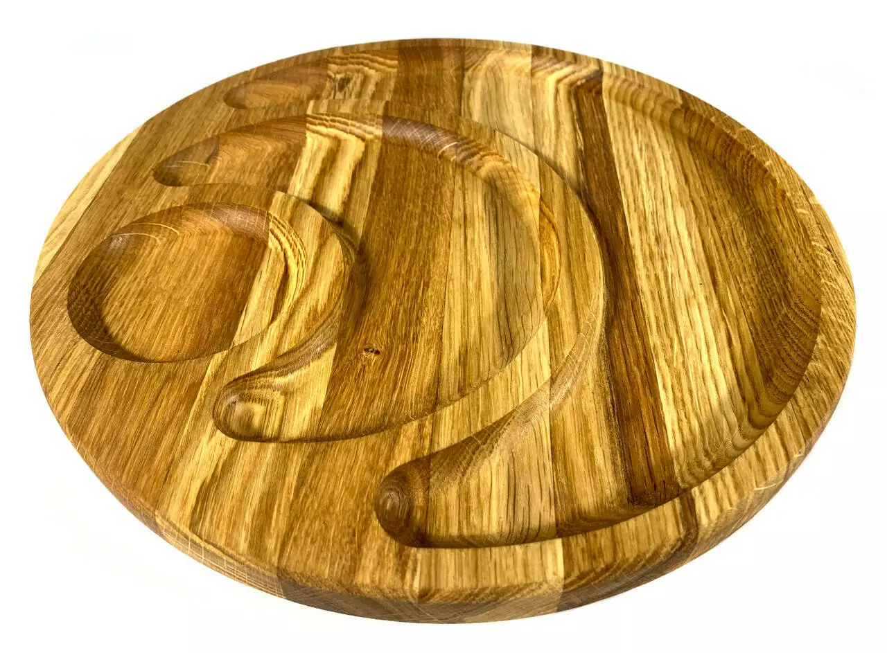 Кожна тарілка виготовлена з цільного дерева товщиною 2 см та вирізана з різноманітними ємностями, ідеальними для подачі різноманітних закусок. Від смачних фруктів до апетитних горішків, вони будуть виглядати дуже привабливо на наших тарілках.