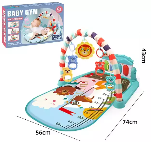Килимок оснащений музичним піаніно, яке відтворює приємні звуки для тренування слуху, і п'ятьма підвісними іграшками з цікавими текстурами, що привертають увагу дитини. Вбудована шкала росту допомагає батькам відстежувати розвиток малюка в комфортних домашніх умовах.