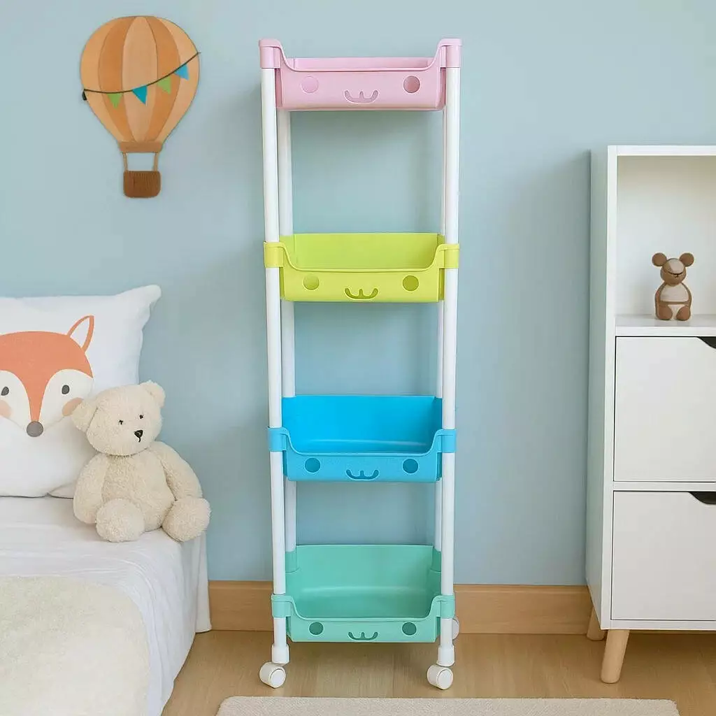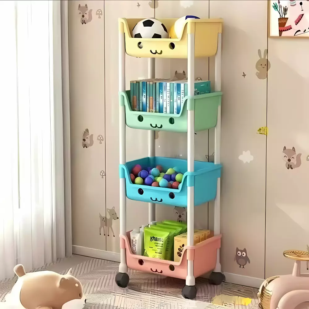 іграшок і речей в дитячій кімнаті. Стелаж має 4 яруси з