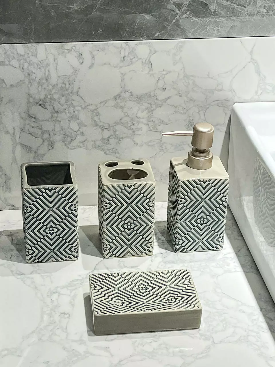 2 стакани: Два стильних стакани в бежевому кольорі з ромбовим дизайном забезпечують організоване зберігання зубних щіток, зубної пасти та інших аксесуарів для гігієни.
