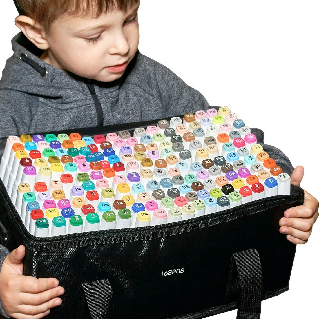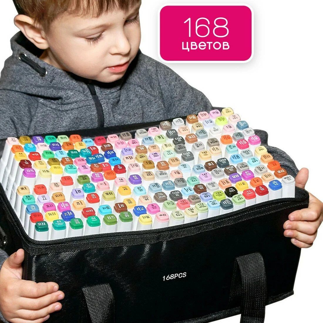 У наборі 168 маркерів різних кольорів. Корпус пластиковий гладкий. Ковпачки щільно закриваються.