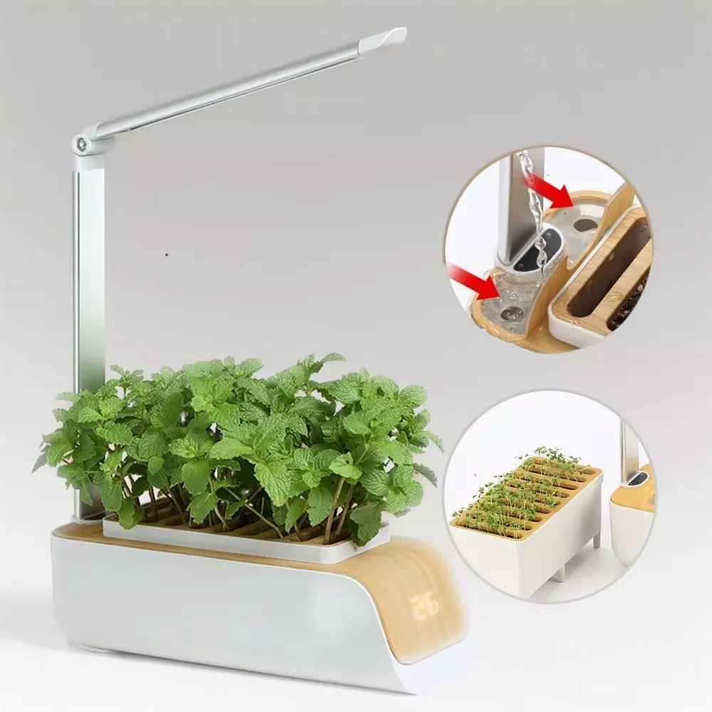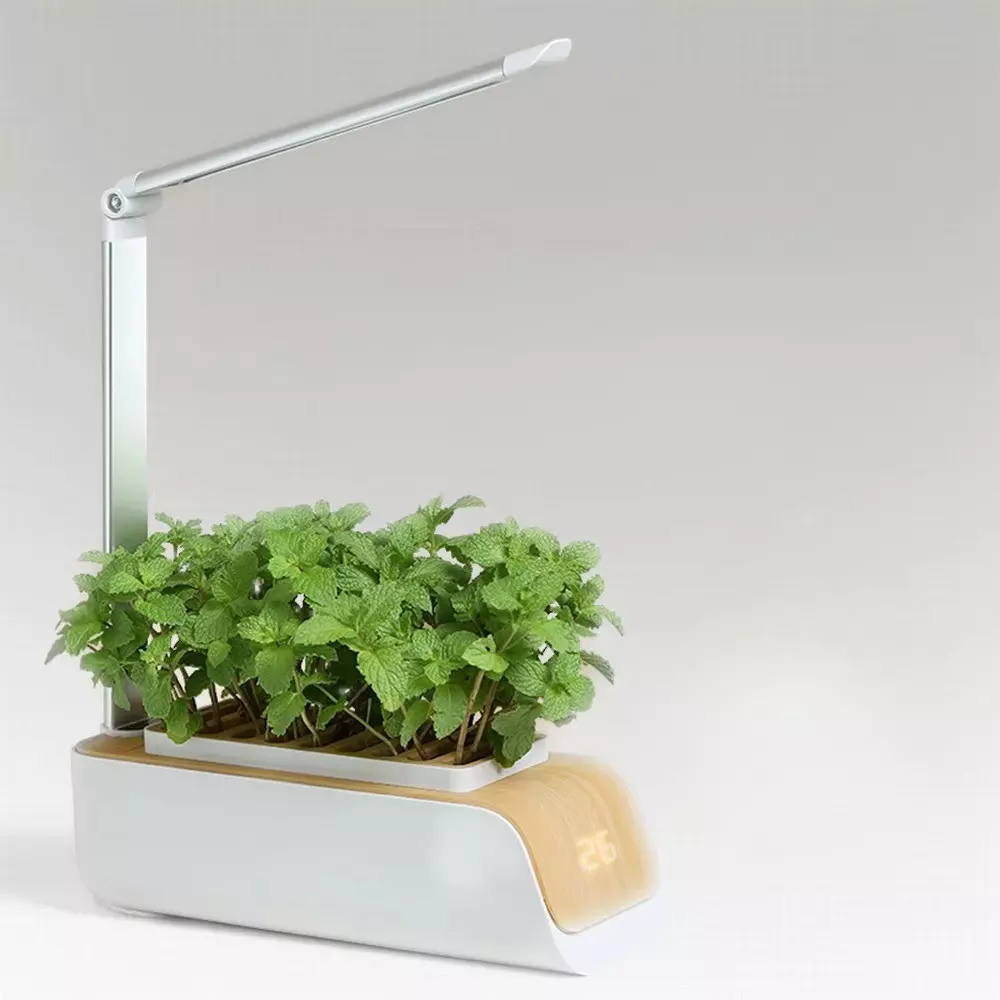 Пристрій виготовлено з міцного ABS-пластику та алюмінієвого сплаву, має 9 посадкових отворів і розміри 37.2×30.2×11.8 см. У комплект входять посадочна база, LED-стійка, USB-кабель, посадковий матеріал, субстрат і інструкція користувача. Процес посадки максимально простий: замочіть субстрат, засипте в отвори, додайте насіння та увімкніть підсвітку. Уже за кілька днів з’являться перші паростки!