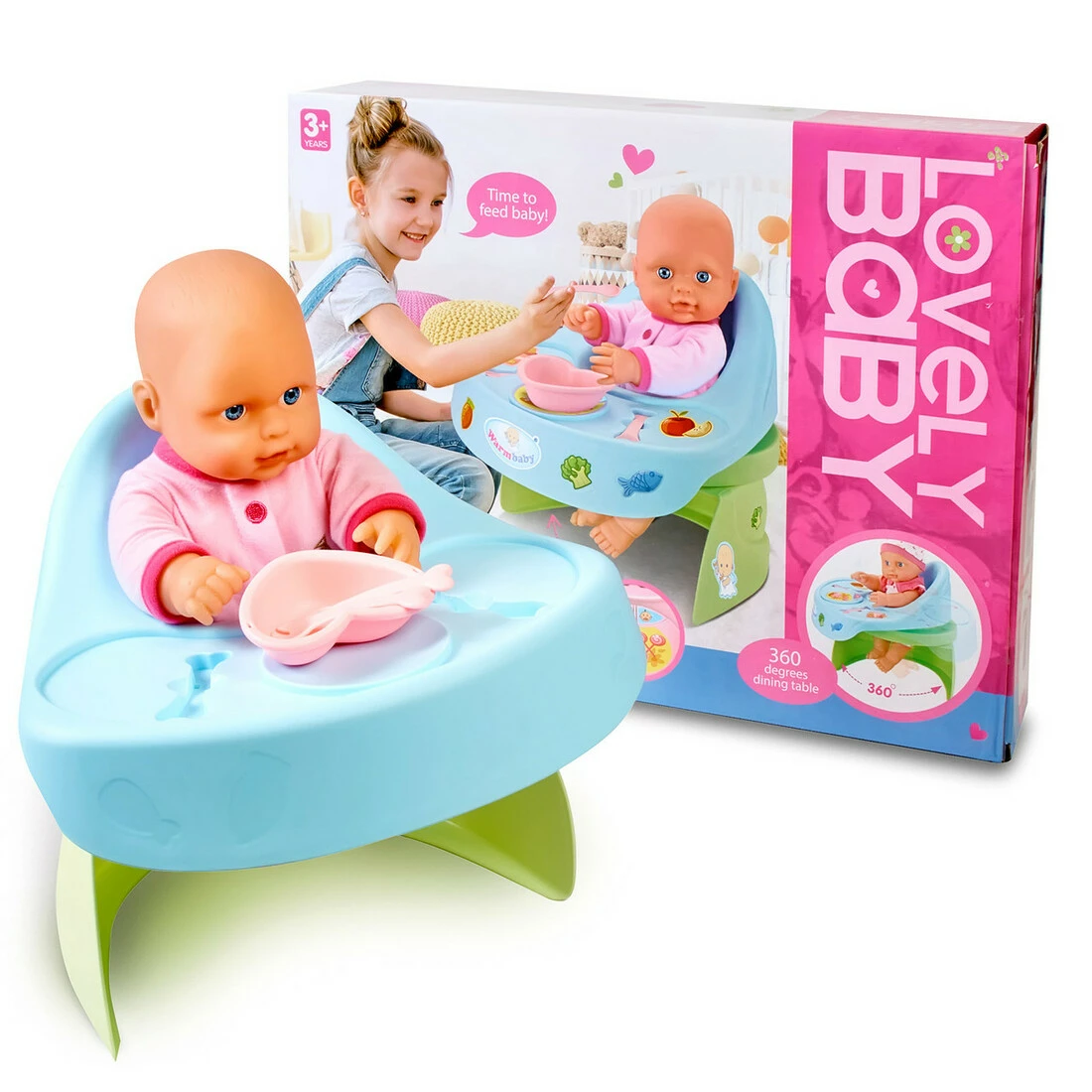 Пупс в комплекті зі столиком для годування, музичний столик на батарейках (у комплект батарейки не входять)