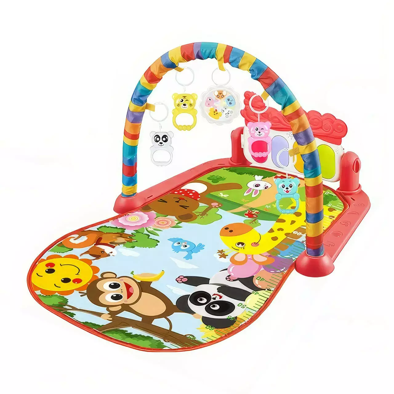 Музичне піаніно з чотирма клавішами та веселими мелодіями на батарейках допоможе дитині досліджувати світ звуків і ритмів, а п'ять підвісних іграшок з різними текстурами та яскравими кольорами розвивають увагу та дотик.