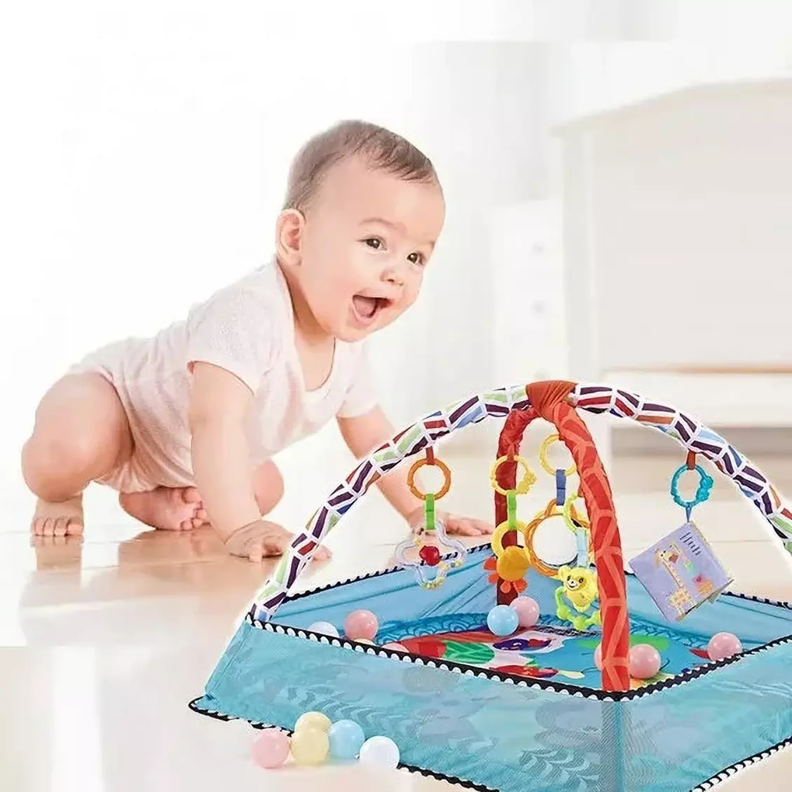 Розмір килимка становить 80×80 см. Ігровий центр включає в себе тренажерний зал, манеж і басейн з м'ячиками, що робить його універсальним рішенням для ігор і розвитку дитини.