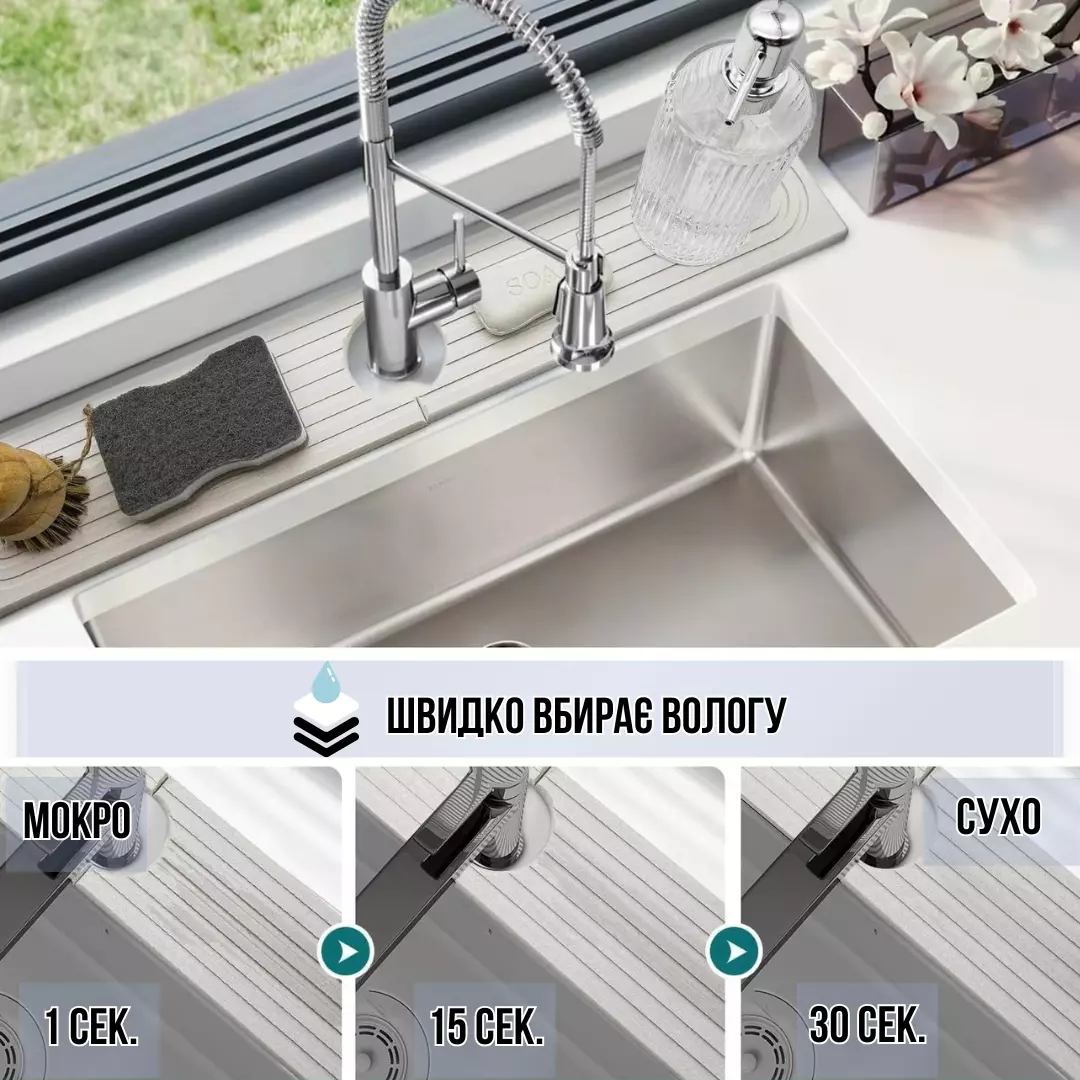 Білосніжний колір килимка гармонійно впишеться в інтер'єр сучасної кухні або ванної кімнати. Його довговічність і стійкість до цвілі забезпечать чистоту і порядок у вашій зоні раковини.