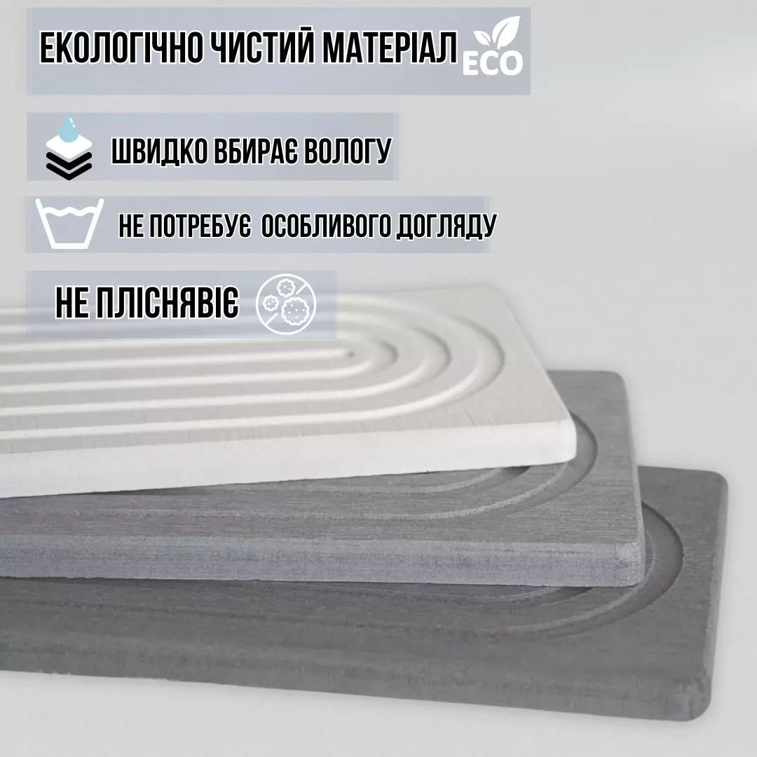 Діатоміт - це натуральний пористий мінерал, що має високу поглинаючу здатність. Килимок моментально поглинає вологу завдяки своїй рефленій поверхні, запобігаючи утворенню калюж і вогкості. Природна стійкість до цвілі та бактерій робить його особливо гігієнічним.