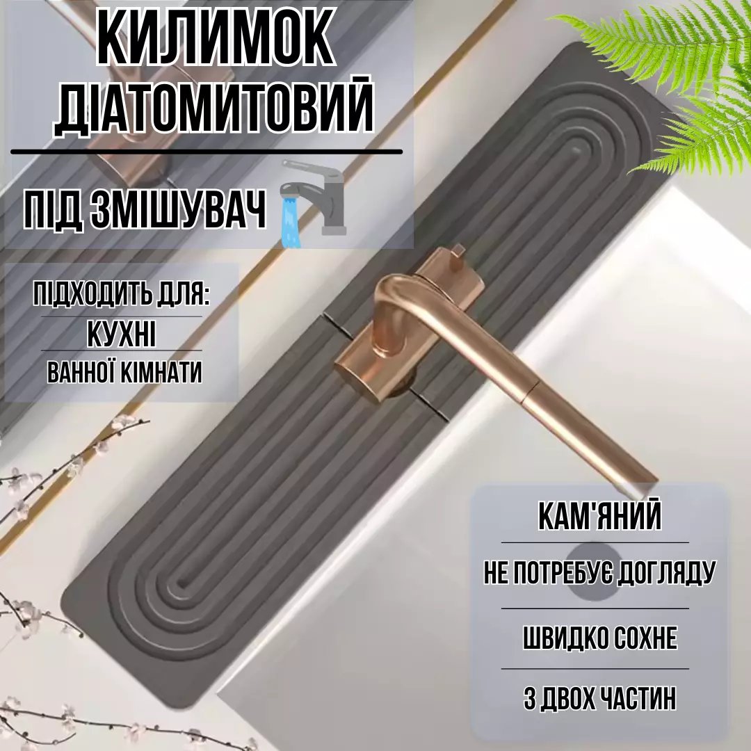 Килимок складається з двох частин, що полегшує його розміщення на будь-якій поверхні. Розмір 60x10 см ідеально підходить для встановлення під змішувачем. Рельєфна форма ефективно вбирає воду, а простий догляд без необхідності прання забезпечує довговічність.