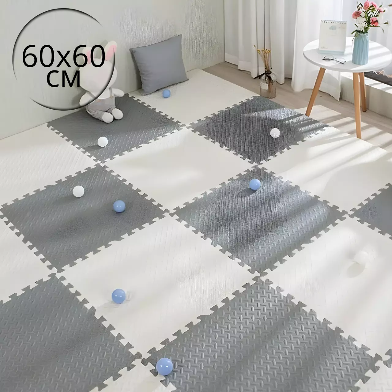 Килимок-пазл підлоговий, термокилимок, без покриття, Eva-піни, 20 пазлів 60*60 см, площа покриття 7,2м², товщина 1 см,білий
