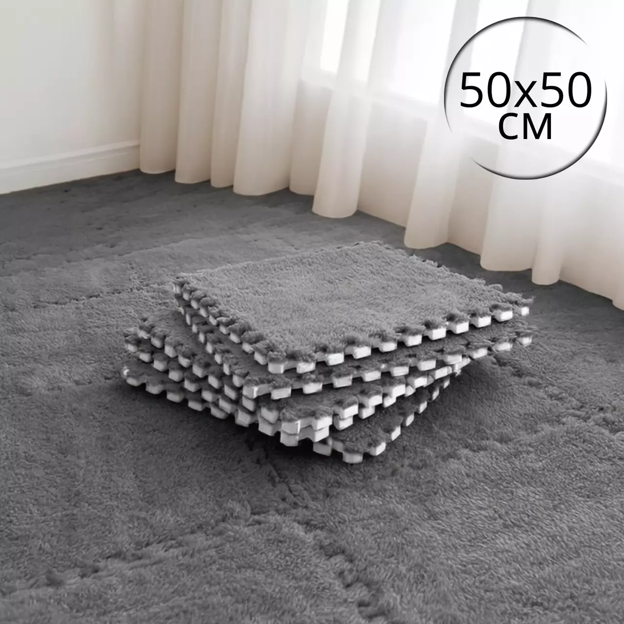 Килимок-пазл з плюшевим покриттям, термоковрик м'який з ворсом 10 пазлів 50х50 см,товщина 1 см, площа покриття 2,5 м², темно-сірий