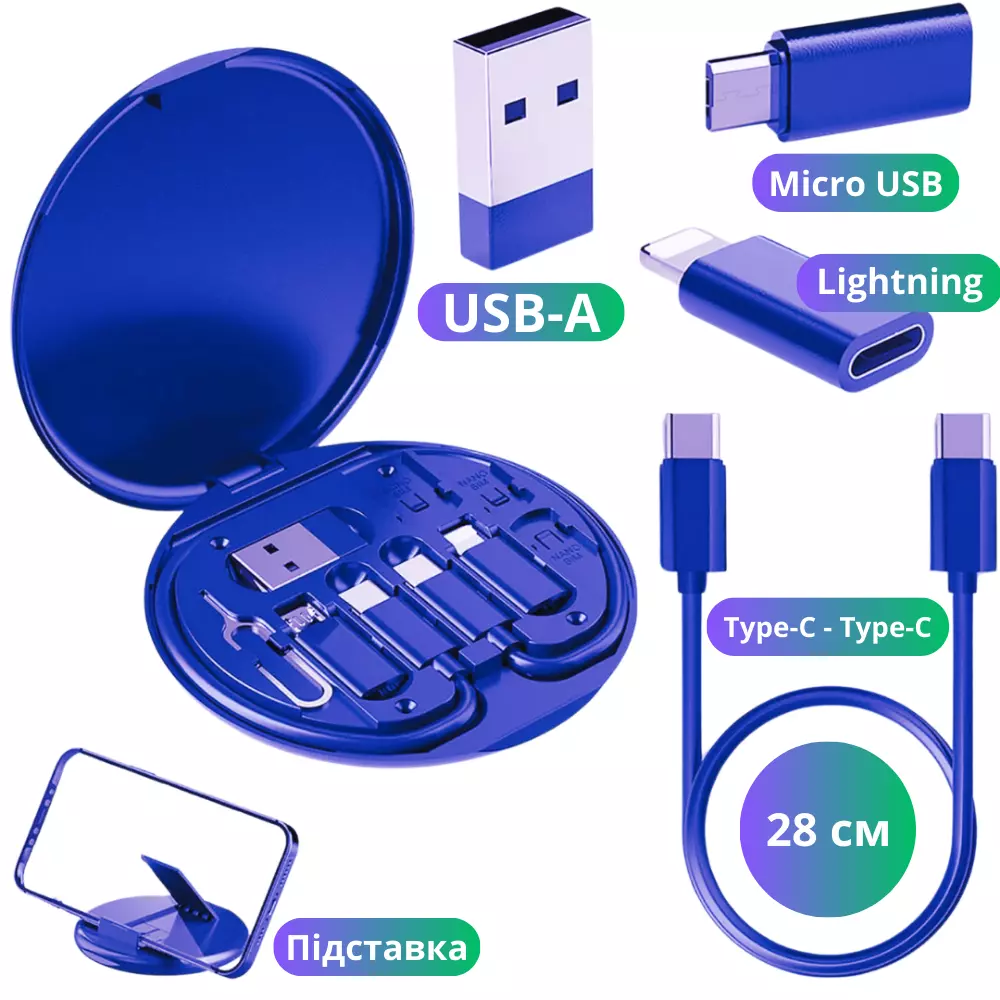 Комплект адаптерів з кабелем Type-C 6в1 для швидкої зарядки та передачі даних 60W у футлярі, синій