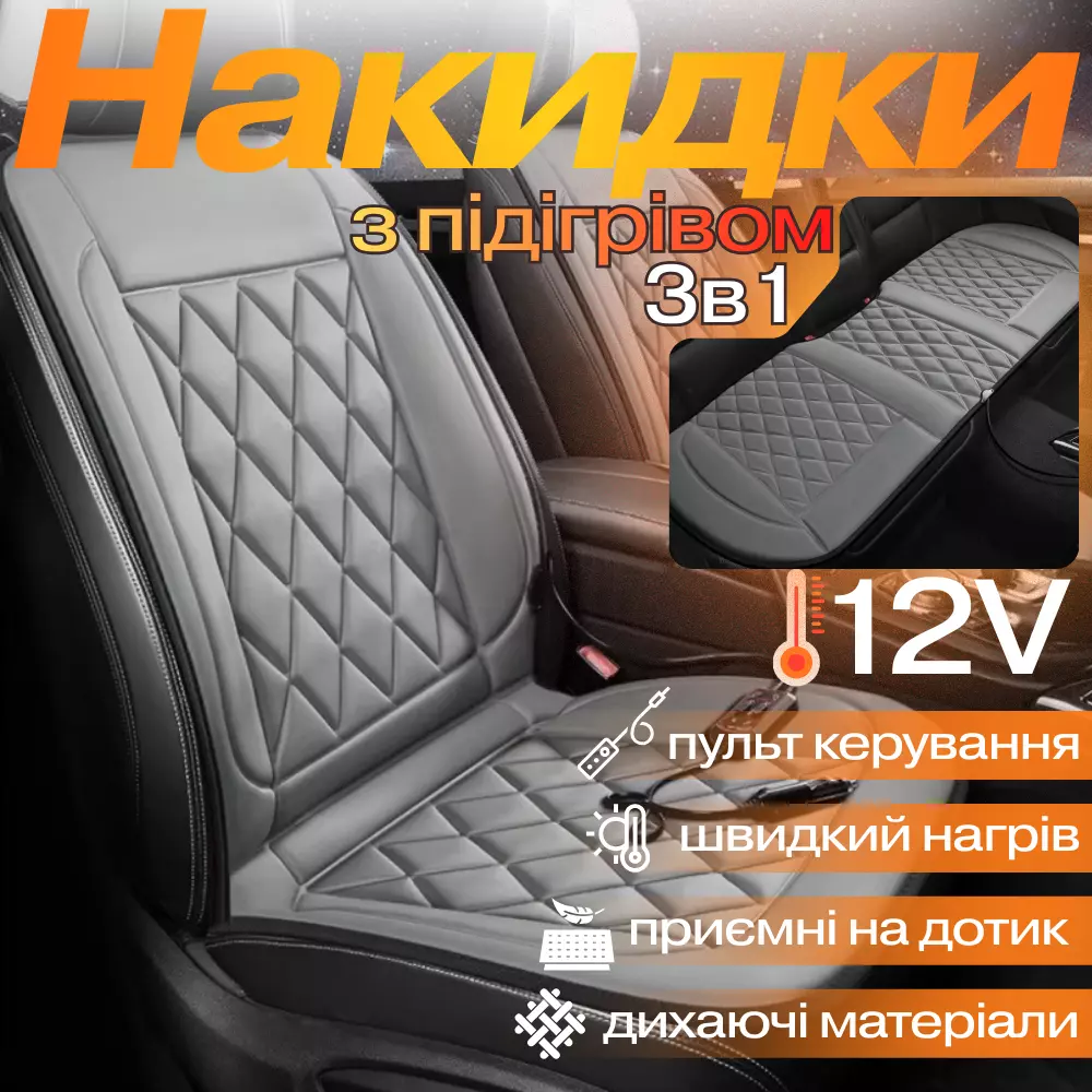 Комплект автомобільних накидок з підігрівом для сидінь 3в1 універсальні в машину від прикурювача 12В, колір сірий