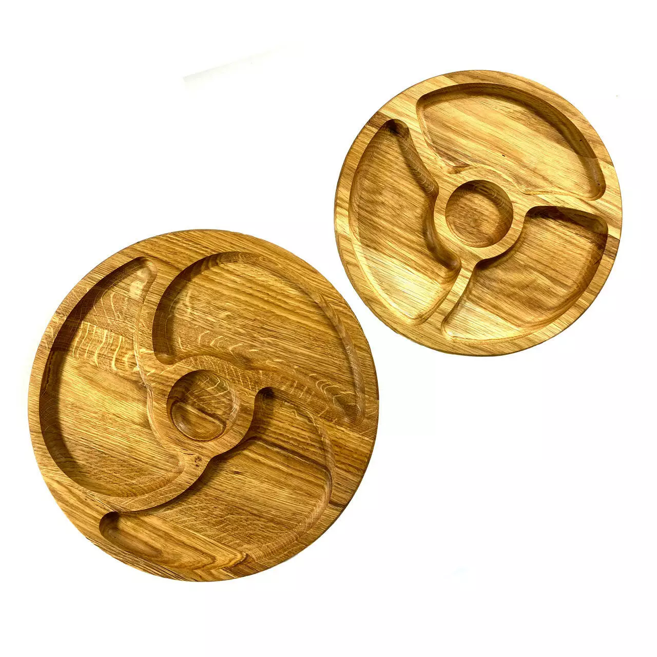Кожна тарілка виготовлена з цільного дерева товщиною 2 см та вирізана з різноманітними ємностями, ідеальними для подачі різноманітних закусок. Від смачних фруктів до апетитних горішків, вони будуть виглядати дуже привабливо на наших тарілках.
