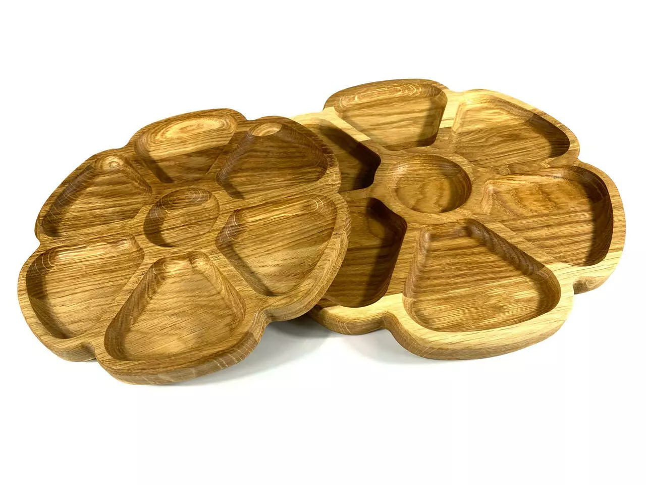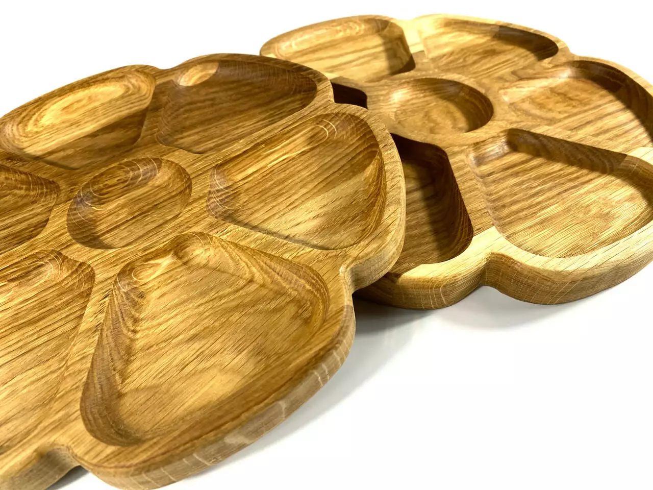 Кожна тарілка виготовлена з цільного дерева товщиною 2 см та вирізана з різноманітними ємностями, ідеальними для подачі різноманітних закусок. Від смачних фруктів до апетитних горішків, вони будуть виглядати дуже привабливо на наших тарілках.