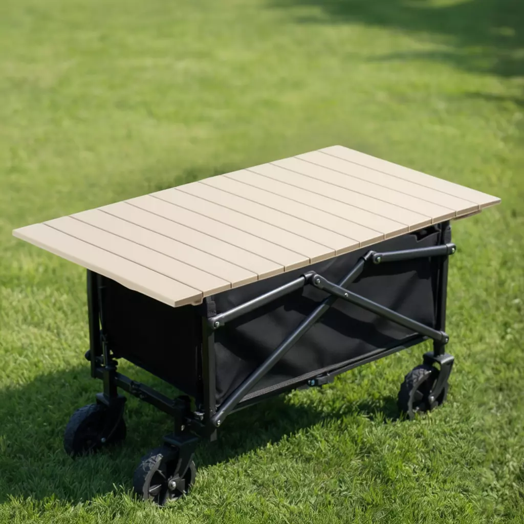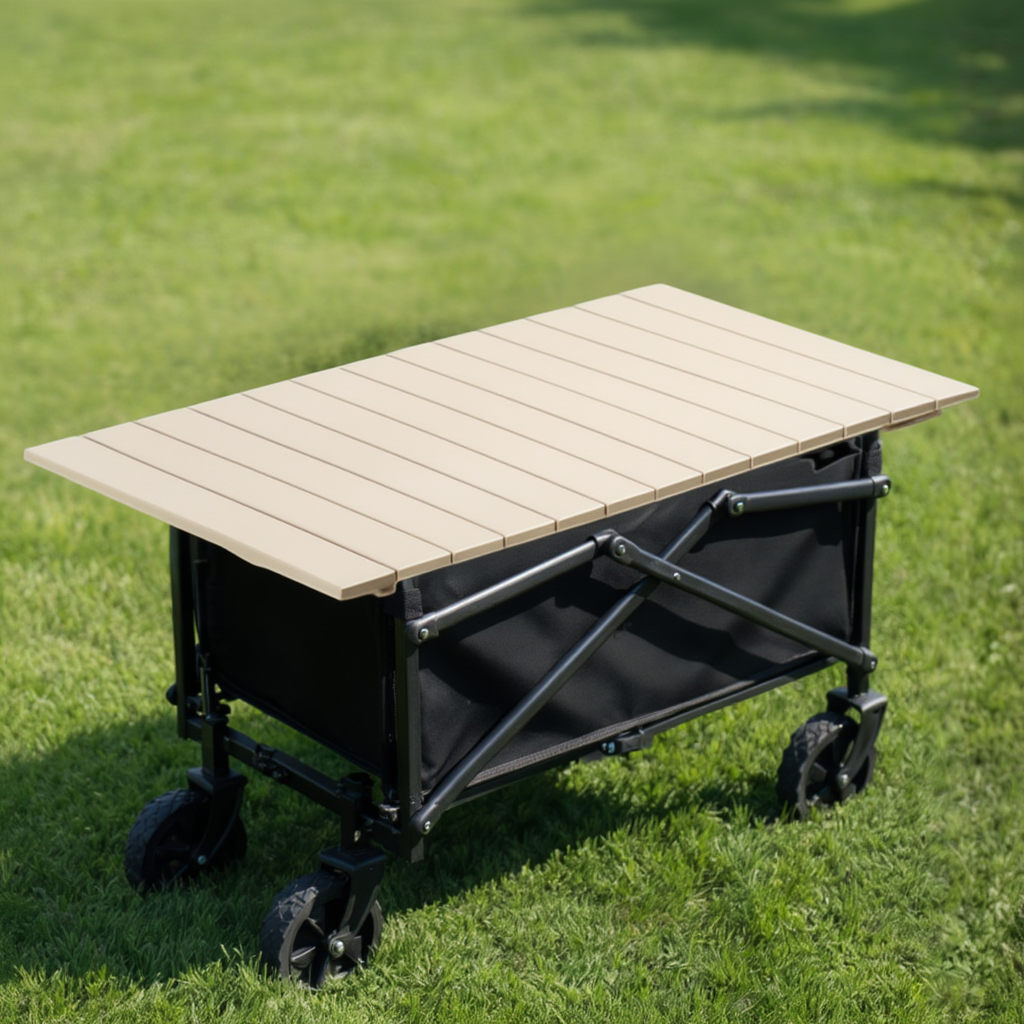 Додатково використовується залізна стільниця, яка встановлюється на тележку і перетворює її на зручну мобільну поверхню для пікніка, приготування їжі або розміщення речей. Стільниця виконана з міцного заліза і може згортатися в рулон, що робить зберігання і транспортування максимально зручними.