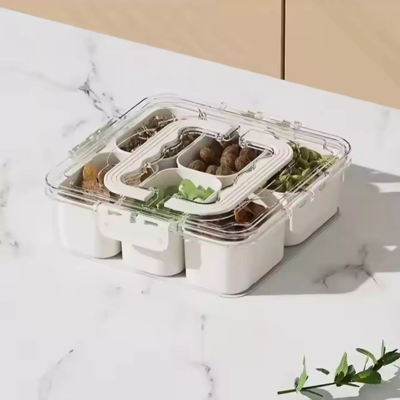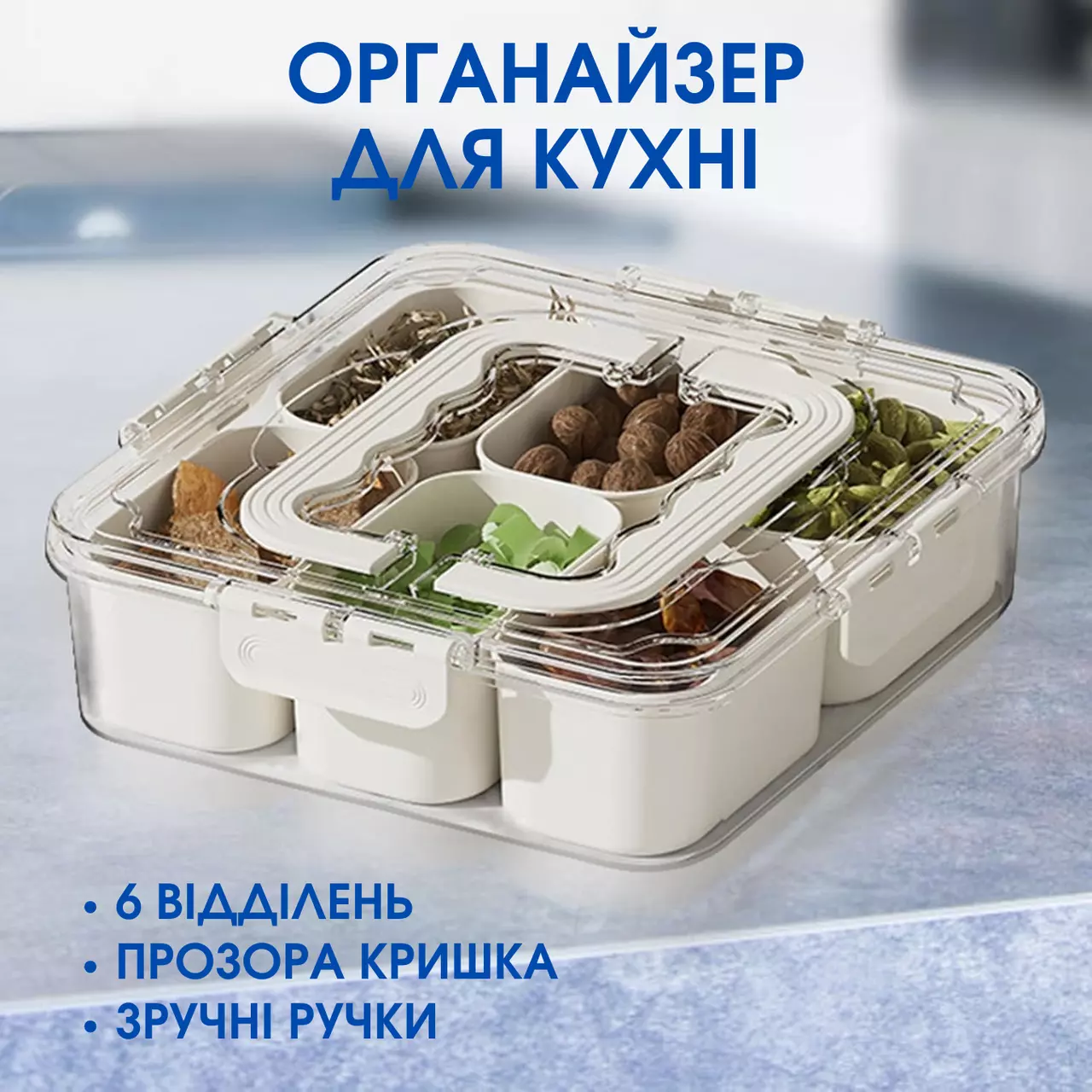 Контейнер для закусок з кришкою і ручками, органайзер для зберігання на 6 осередків, розмір 21×21×7 см