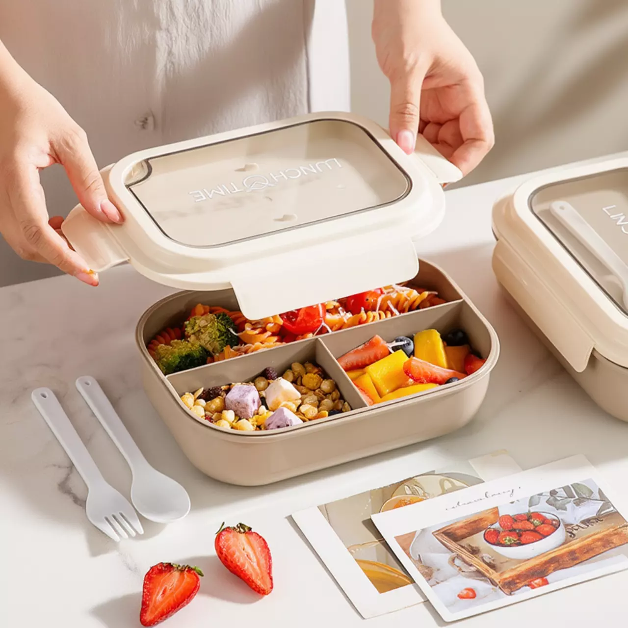 Контейнер, ланч-бокс для гарячої та холодної їжі з окремими відсіками та столовими приборами для їжі, бежевий