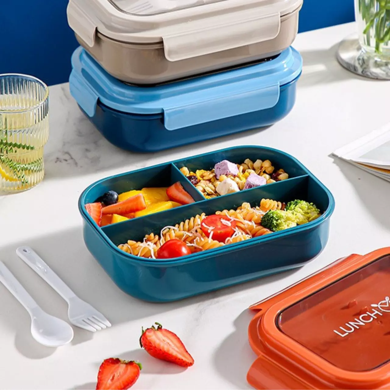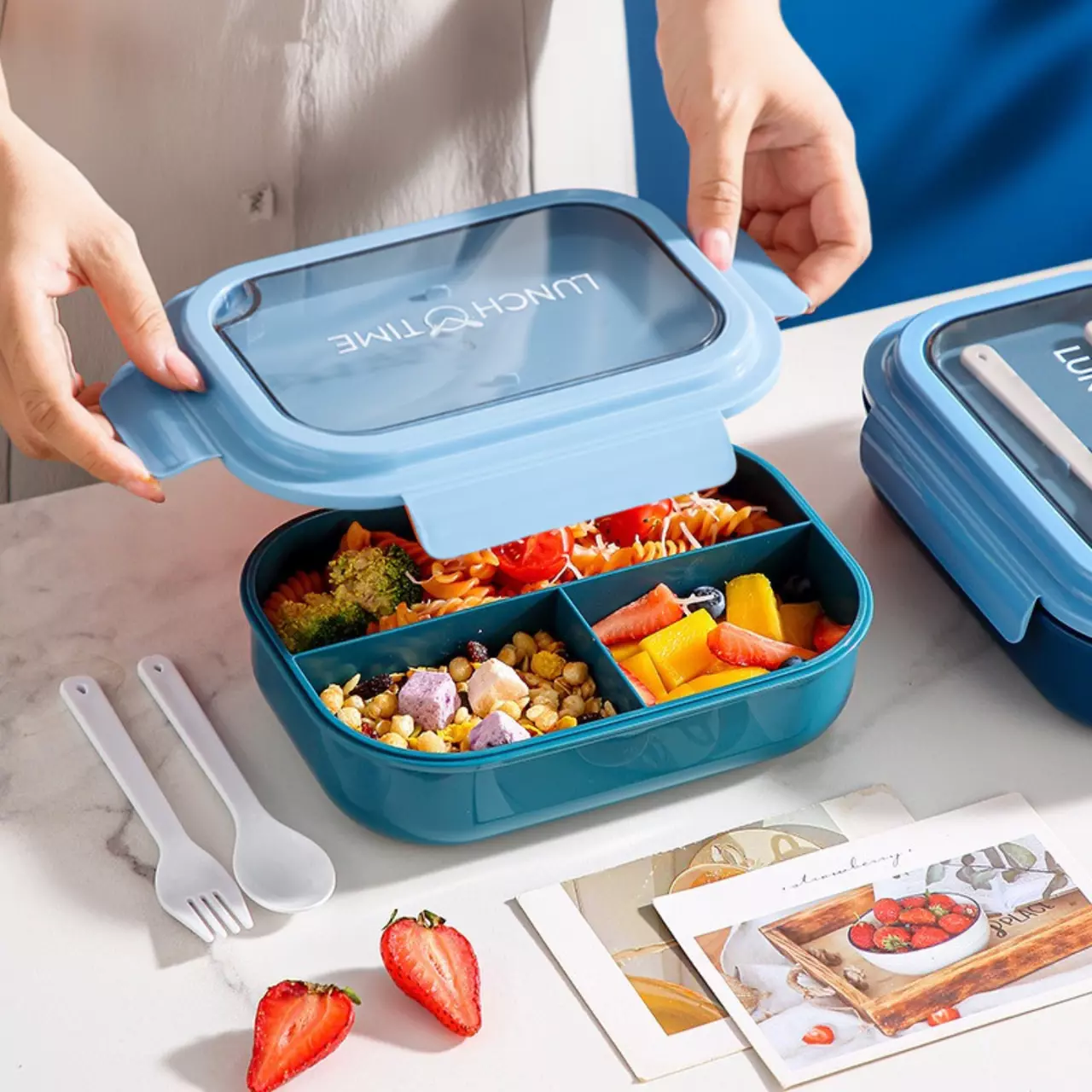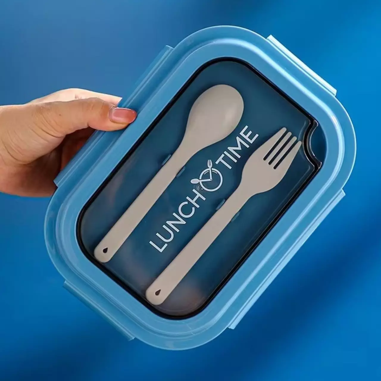 Контейнер, ланч-бокс для гарячої та холодної їжі з окремими відсіками та столовими приборами для їжі, синій