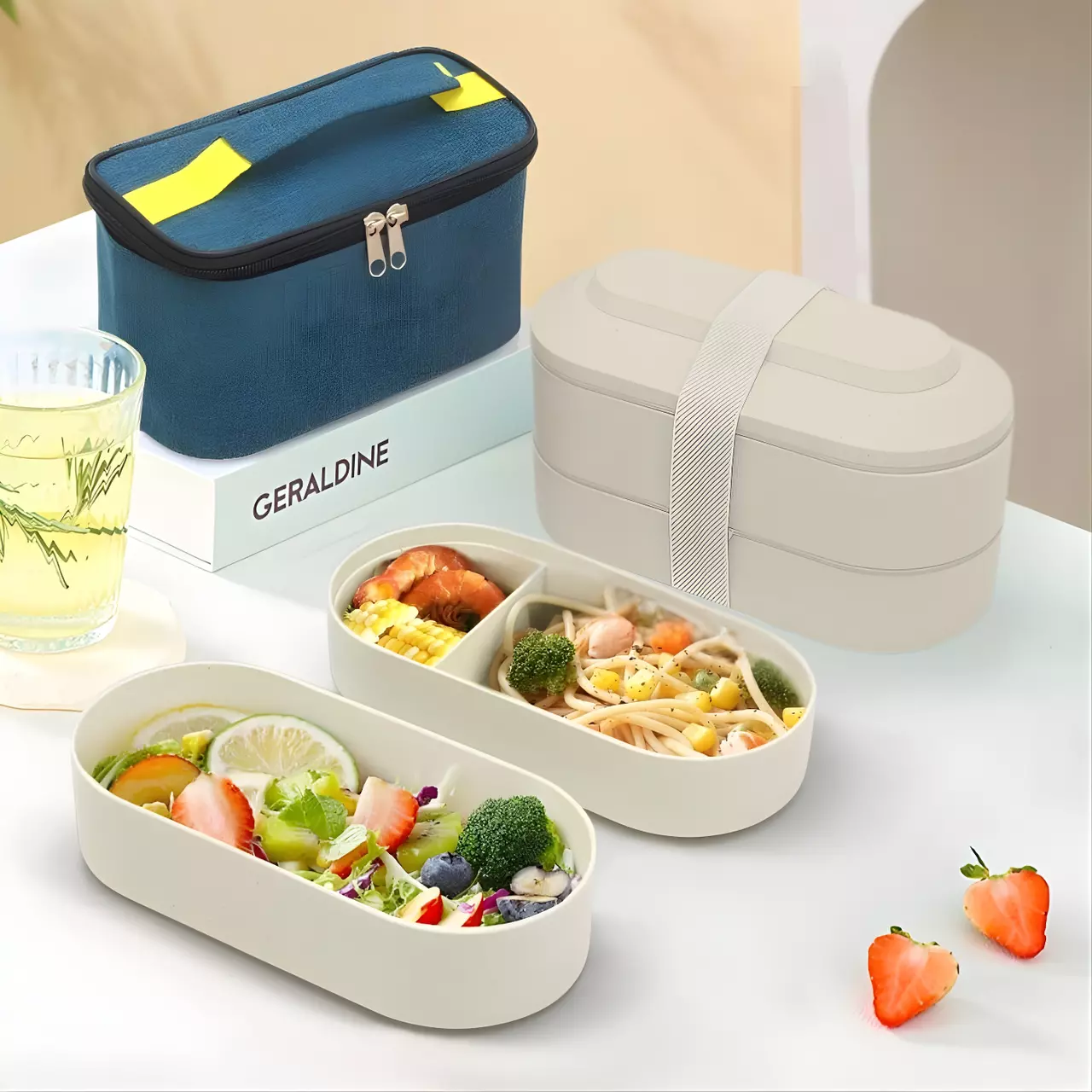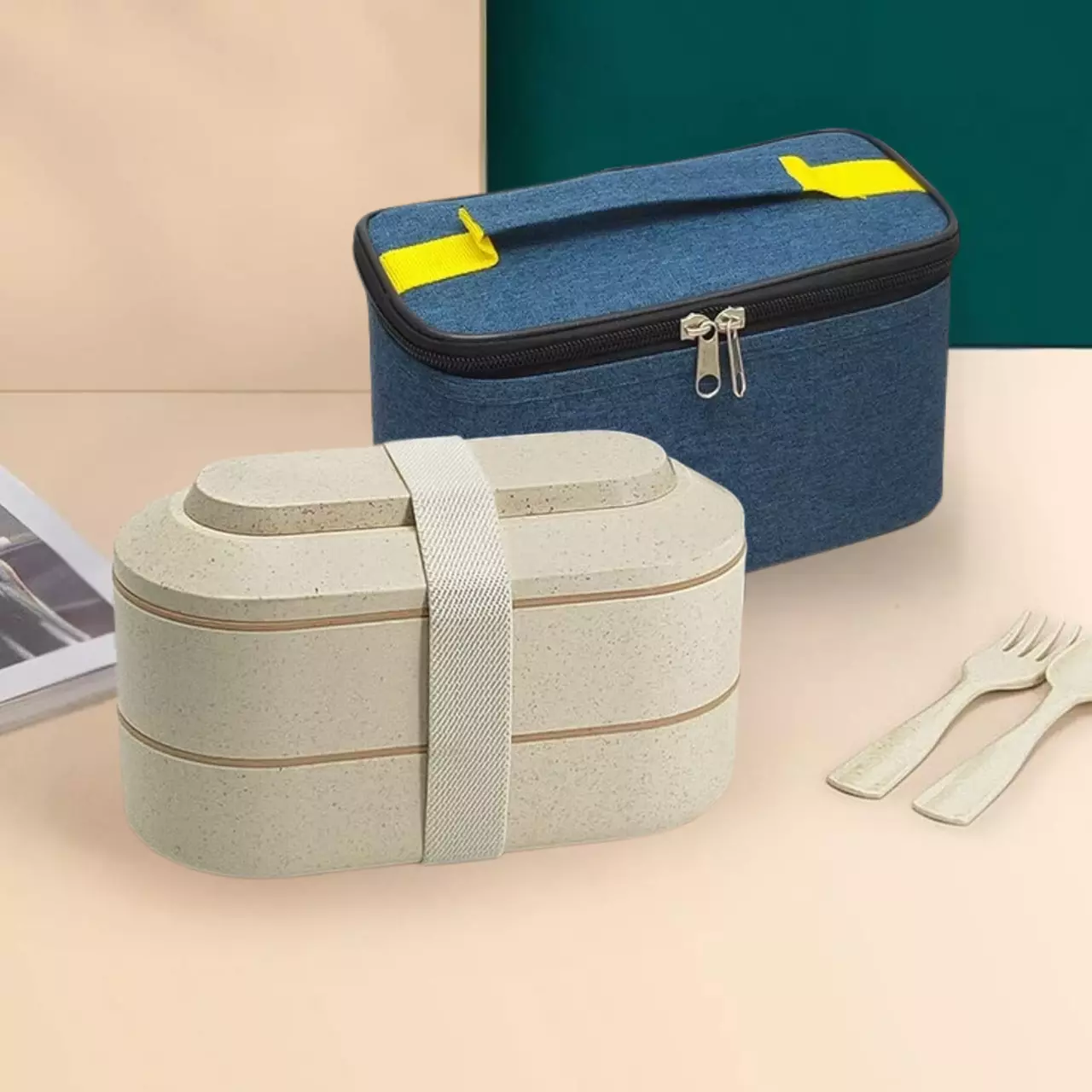 Контейнер, ланч-бокс для гарячої та холодної їжі з термосумкою, двоярусний для обіду зі столовими приборами, 900 мл, бежевий