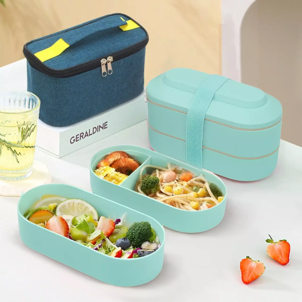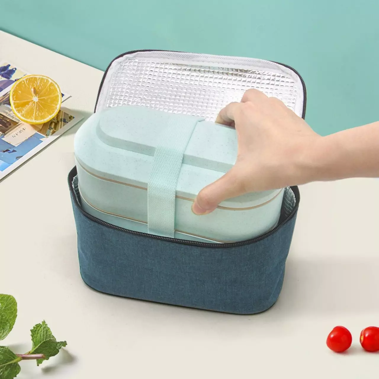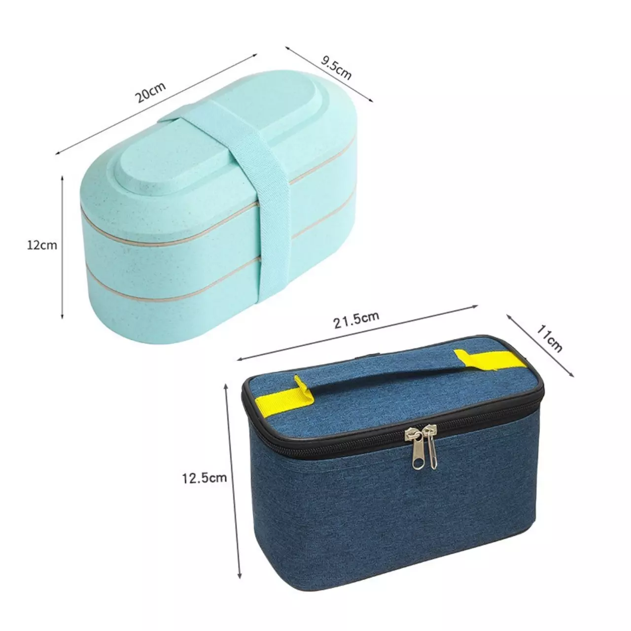 Контейнер, ланч-бокс для гарячої та холодної їжі з термосумкою, двоярусний для обіду зі столовими приборами, 900 мл, блакитний