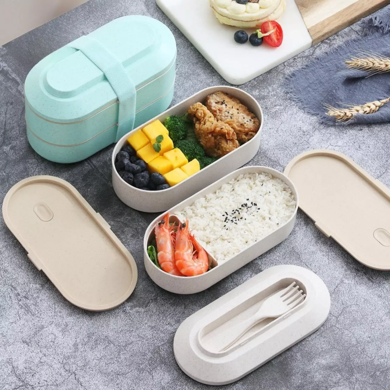 Верхня кришка оснащена окремим відсіком для зберігання столових приборів. У комплект входять виделка і ложка, що робить ланч-бокс зручним рішенням для використання поза домом.
