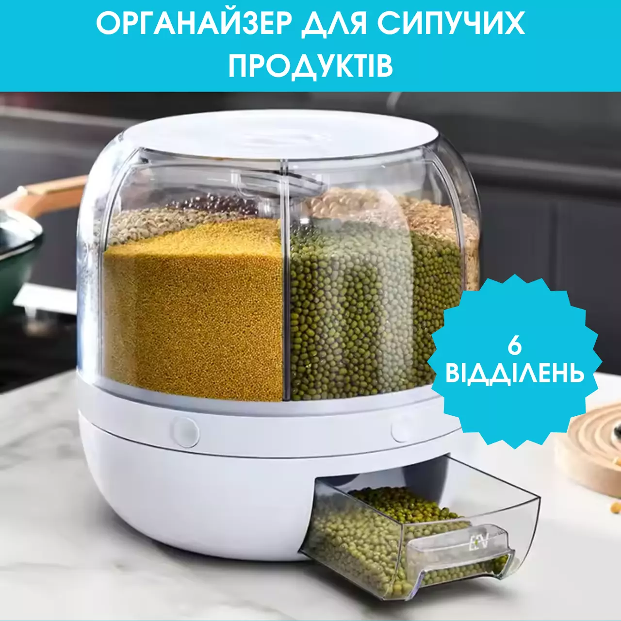 Кухонний органайзер для сипучих продуктів, обертовий диспенсер із 6 відділеннями, білий колір
