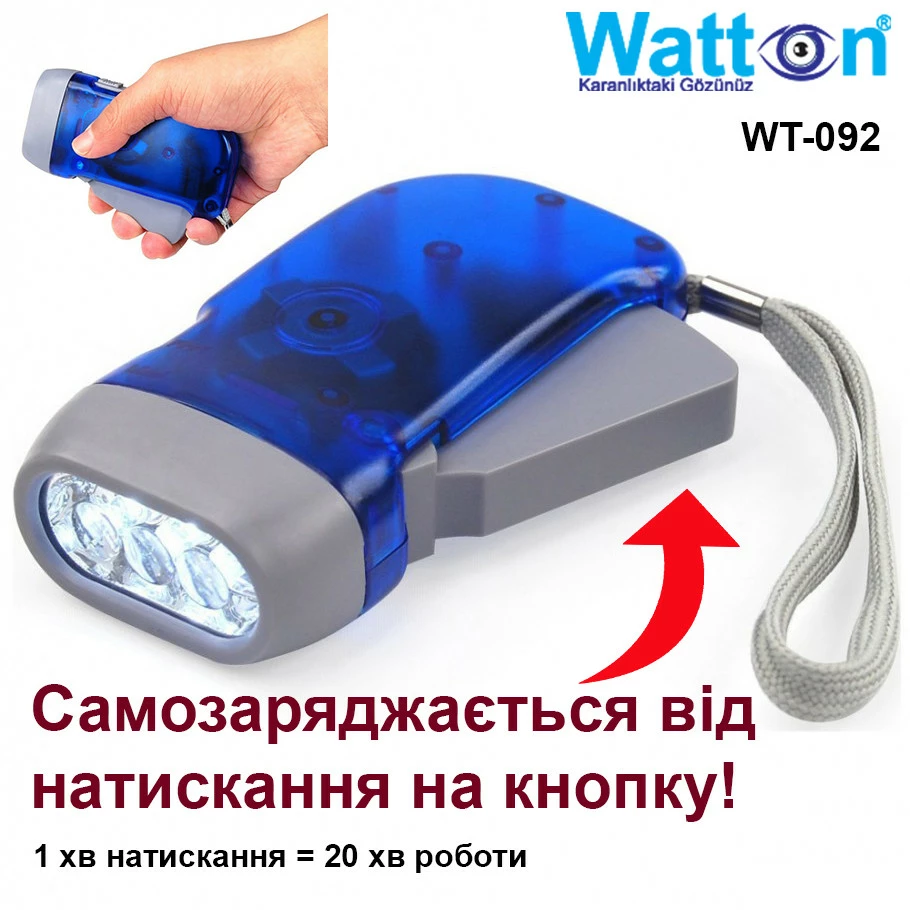 В основу роботи ліхтаря Watton WT-092 покладено наявність високоефективного перетворювача енергії (динамо) для роботи 3 світлодіодних ламп ліхтаря. не використовує елементів живлення та зарядки від електромережі.