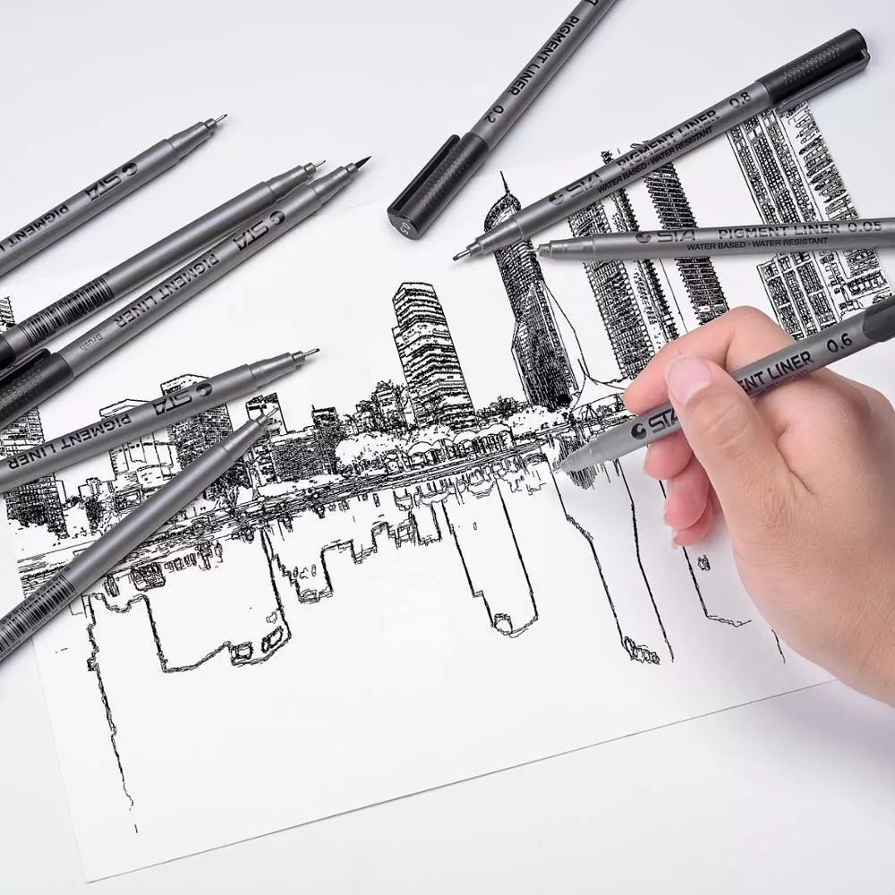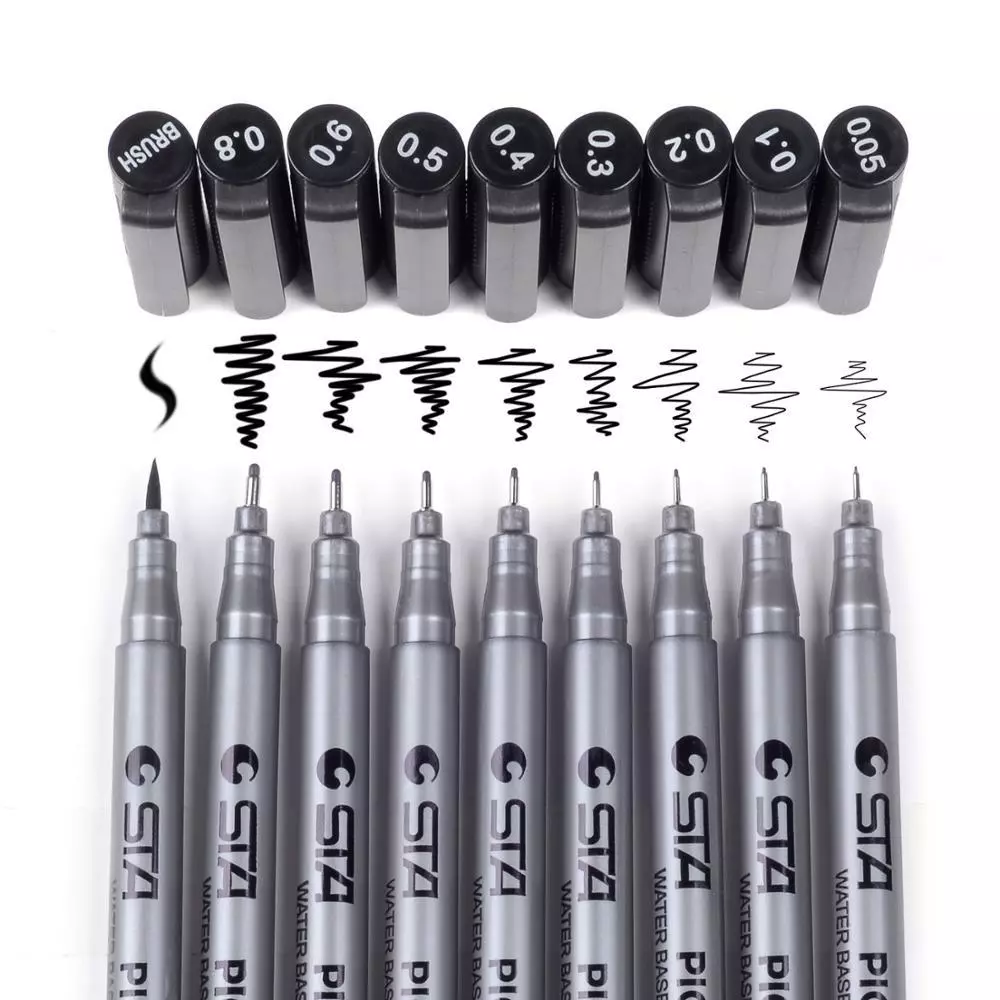 Зручний при використанні лінійки та трафарету. У наборі представлено 9 розмірів: 0.05 , 0.1 , 0.2, 0.3 ,0.4, 0.5, 0.6, 0.8 і маркер brush.