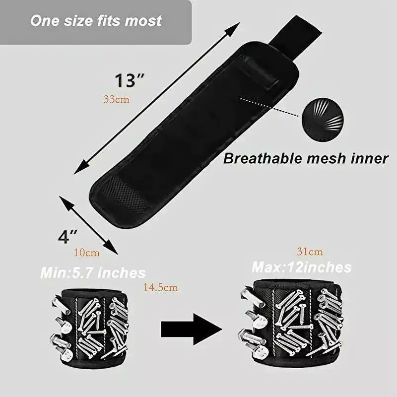 Виготовлений з міцного матеріалу, цей браслет оснащений потужною магнітною пластиною, яка надійно утримує цвяхи, гвинти, болти та інші дрібні металеві деталі під час роботи. Завдяки універсальному дизайну, браслет підходить для будь-якого зап'ястя, забезпечуючи комфорт та зручність у використанні. Чорний колір додає браслету стильного вигляду, роблячи його практичним і модним аксесуаром.