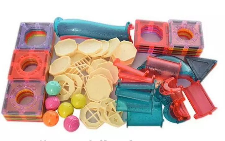 Магнітний конструктор для найменших діток складається з пластикових та металевих деталей різних геометричних форм та вбудованих у них магнітів. Магніти, у свою чергу, вільно обертаються всередині пластику і повертаються один до одного потрібним полюсом, тому завжди притягуються.
