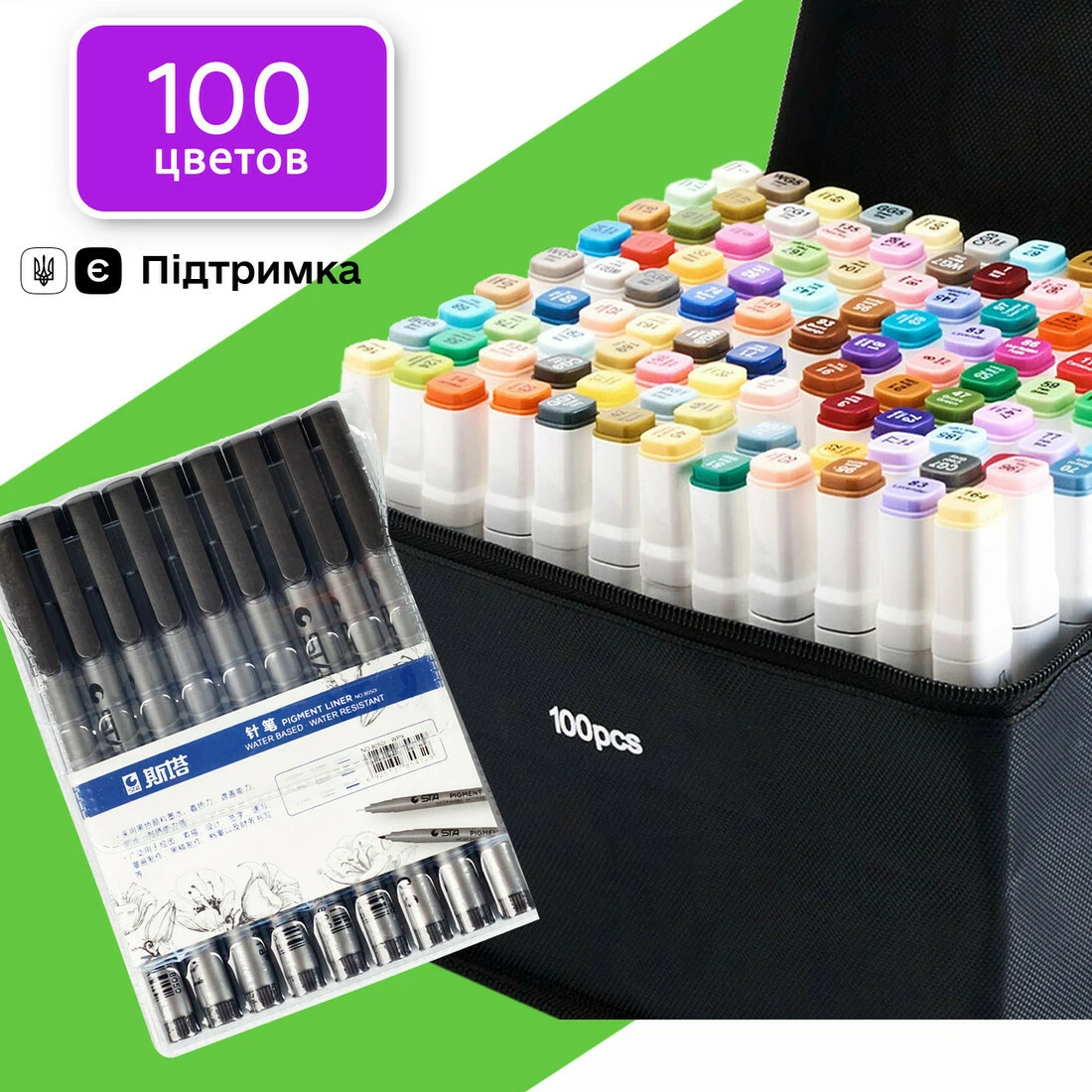 У наборі 100 маркерів різних кольорів.
