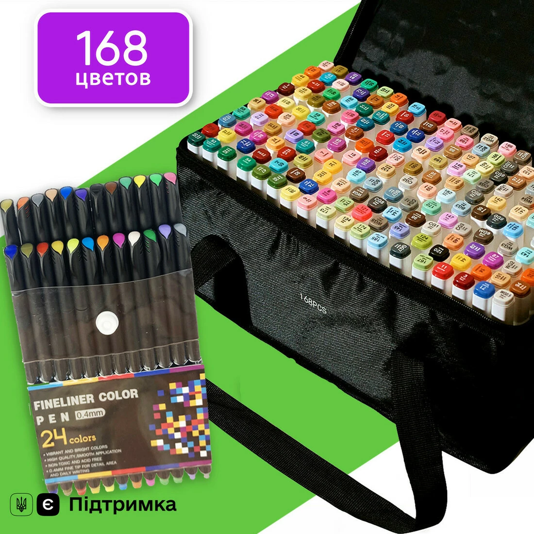 Ви купуєте Набір двосторонніх маркерів Touch Smooth для скетчинга на спиртовій основі 168 штук і разом з ними отримуєте набір якісних лайнерів 24 кольору діаметром 0.4 мм