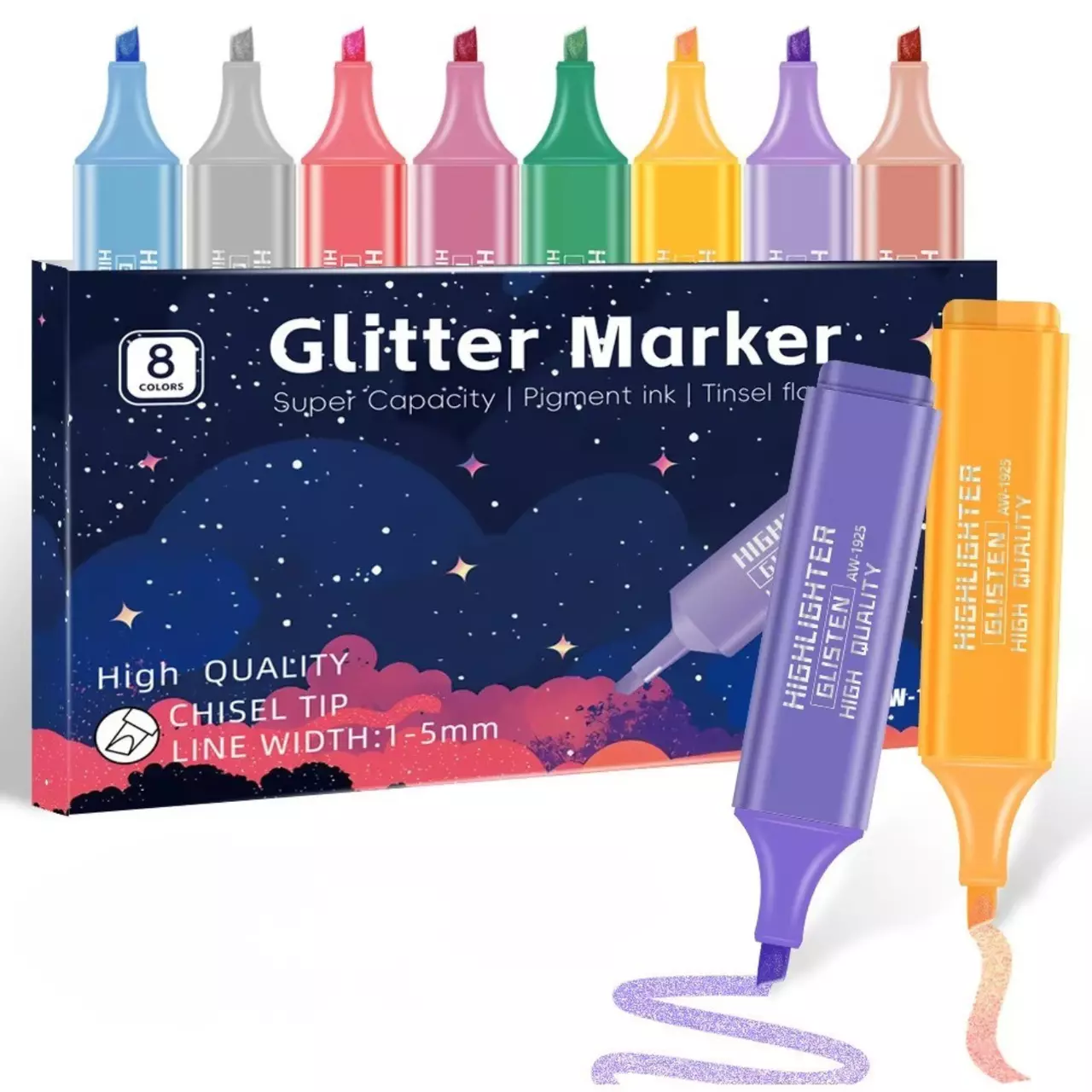 Набір глітерних маркерів — ідеальний інструмент для творчості, оформлення та декору. Маркери оснащені пігментним чорнилом з ефектом мерехтіння (tinsel flash), яке надає малюнкам насичений колір і яскравий блиск. Завдяки великому об’єму чорнила забезпечується тривале використання без втрати якості.