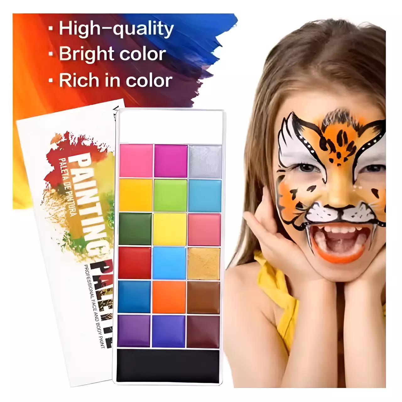 Наші фарби для обличчя на водній основі ідеально підходять для створення яскравих і безпечних малюнків на шкірі. Цей набір для бодіарту включає 20 насичених кольорів, які легко змішуються, дозволяючи вам створювати безмежні колірні комбінації та виразні образи.