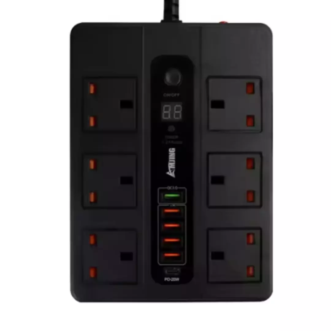 Мережевий фільтр BKL-11 з функцією таймера на 6 розеток 10А 250V + 1 PD20W + 1 QC3.0 + 4 USB, чорний