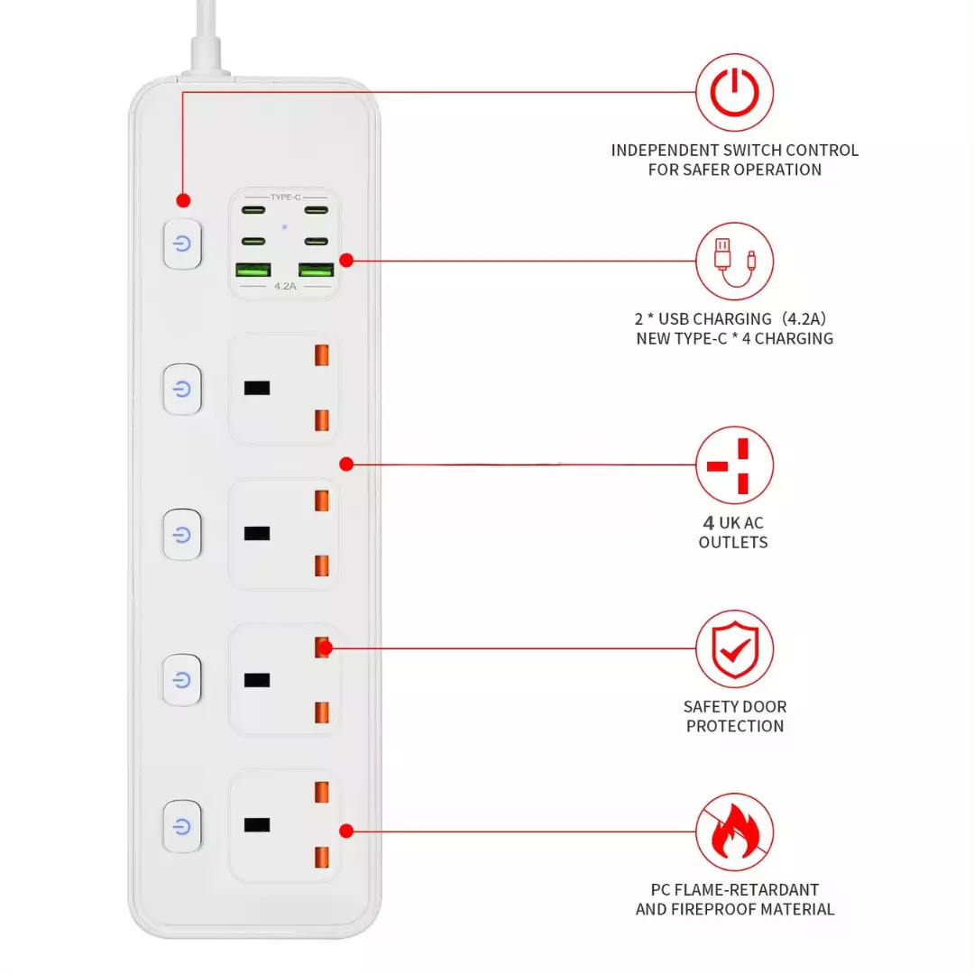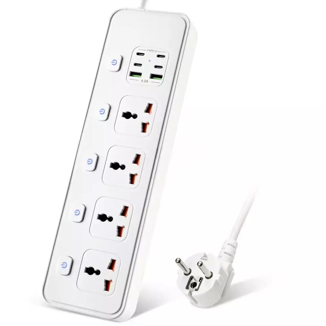 Мережевий фільтр виготовлений з вогнестійкого матеріалу PC, що забезпечує додаткову безпеку та довговічність експлуатації. Він оснащений незалежним вимикачем, що дозволяє легко відключати всі підключені пристрої за потреби. Довжина кабелю в 2 метри забезпечує гнучкість у розміщенні фільтра, а білий колір та вилка ЕС роблять його легко інтегруємим в будь-який інтер'єр та електросистему. Цей фільтр ідеально підходить для тих, хто шукає надійне і багатофункціональне рішення для управління живленням.