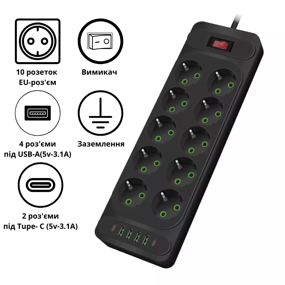 Мережевий фільтр подовжувач 2 м на 10 євро-розеток, 4 USB + 2 Tupe-C, 3000Вт із заземленням і вимикачем, чорний