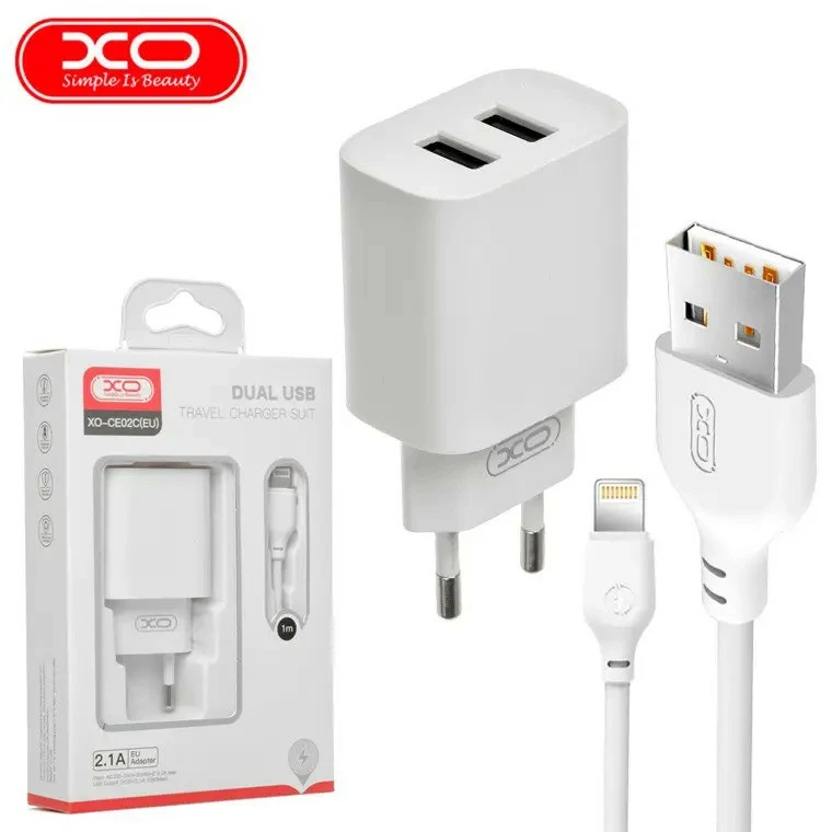 Мережевий зарядний пристрій XO CE02C на 2USB 2.1A Білий + Кабель Lightning