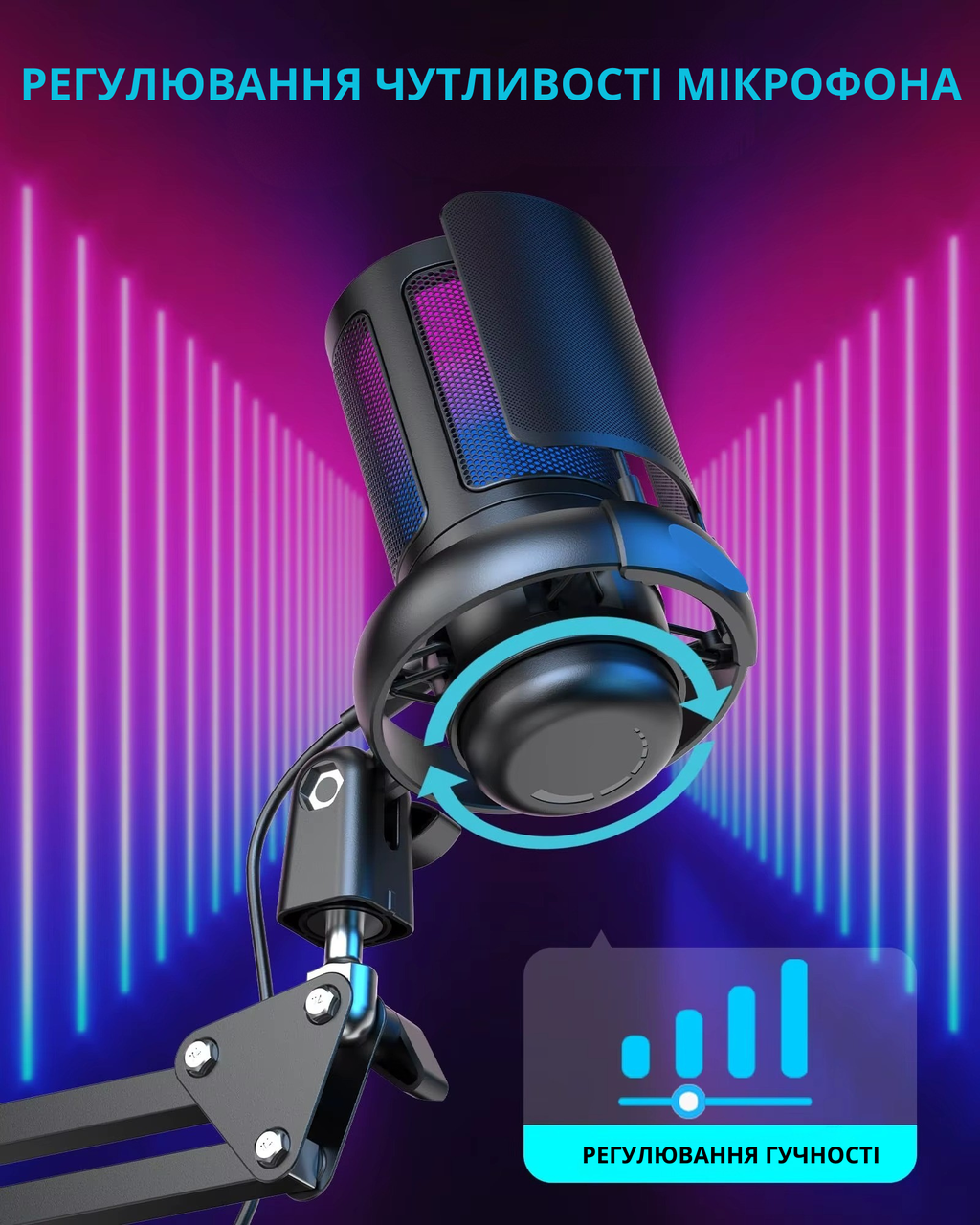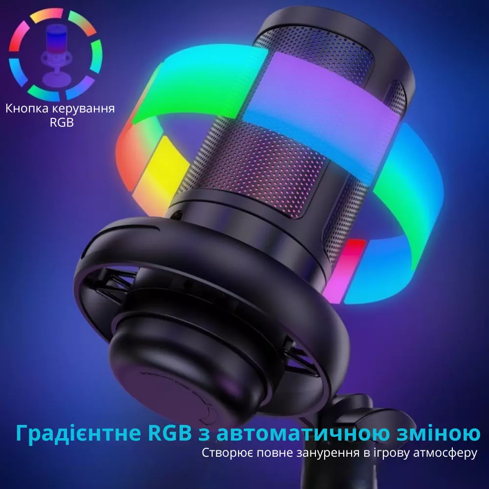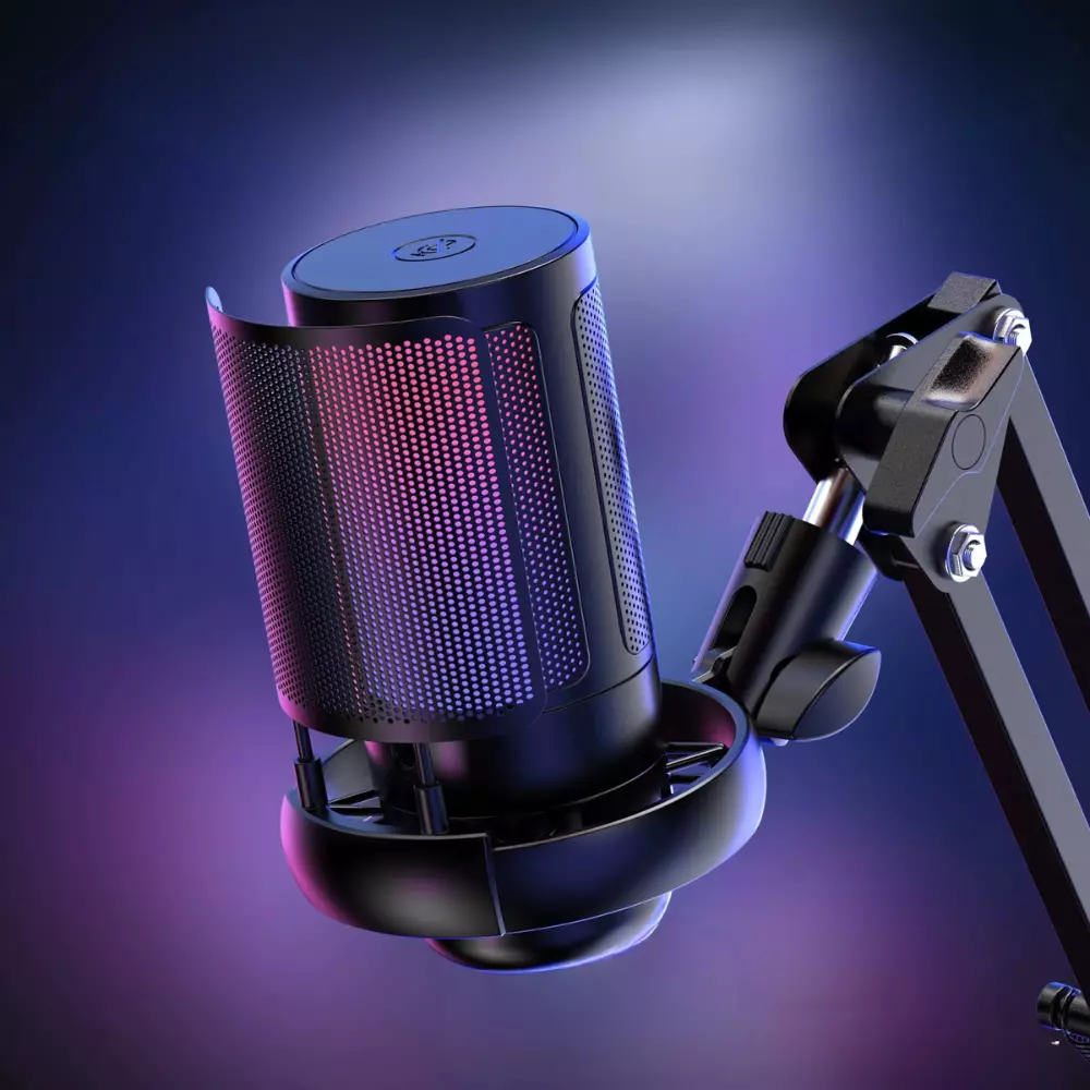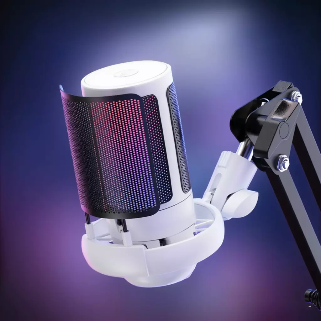 Вбудоване шумопригнічення Noise Cancelling ефективно зменшує навколишні звуки, що особливо важливо під час роботи в шумному середовищі. Мікрофон підключається через USB-інтерфейс, не потребує драйверів і сумісний із ПК, ноутбуками та ігровими консолями. RGB-підсвічування створює стильний ігровий ефект і робить сетап більш виразним.