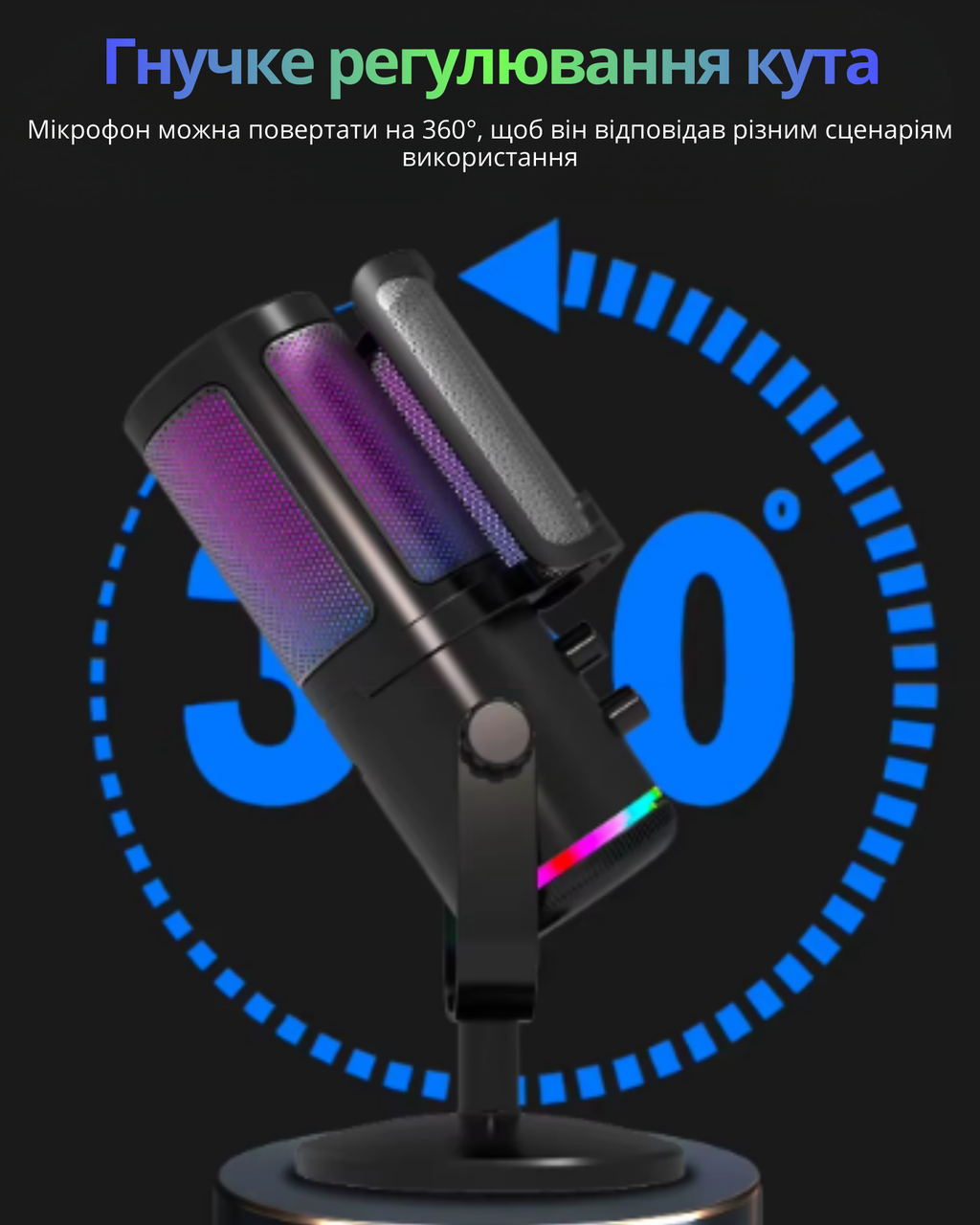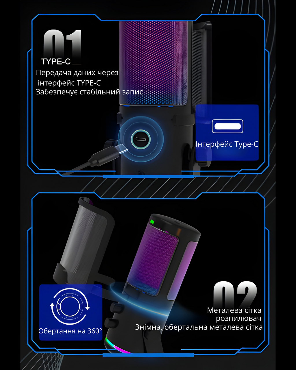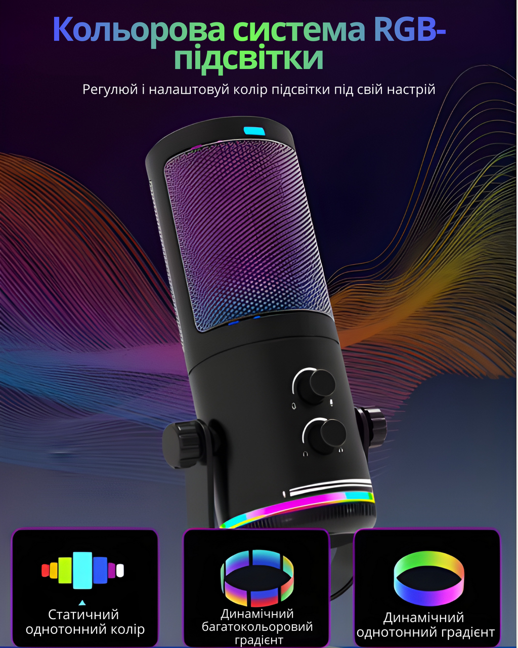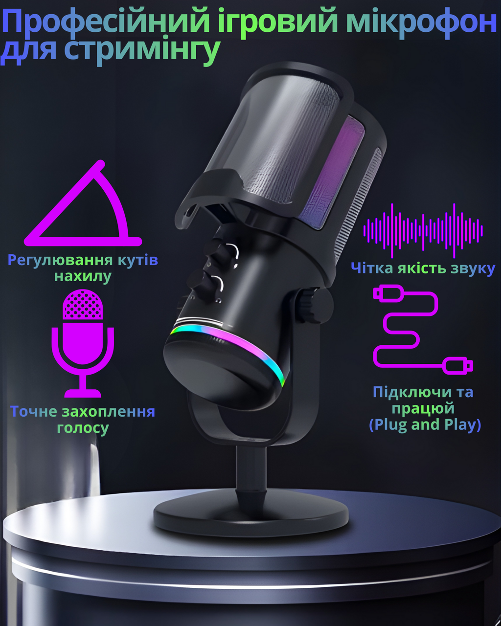Мікрофон оснащений вбудованою звуковою картою та системою шумоподавлення, що робить звук більш розбірливим і професійним. Стильна RGB-підсвітка створює атмосферу ігрового сетапу та підкреслює сучасний дизайн. Корпус виконаний із міцного металу та ABS-пластику, забезпечуючи довговічність і стійкість при щоденному використанні.